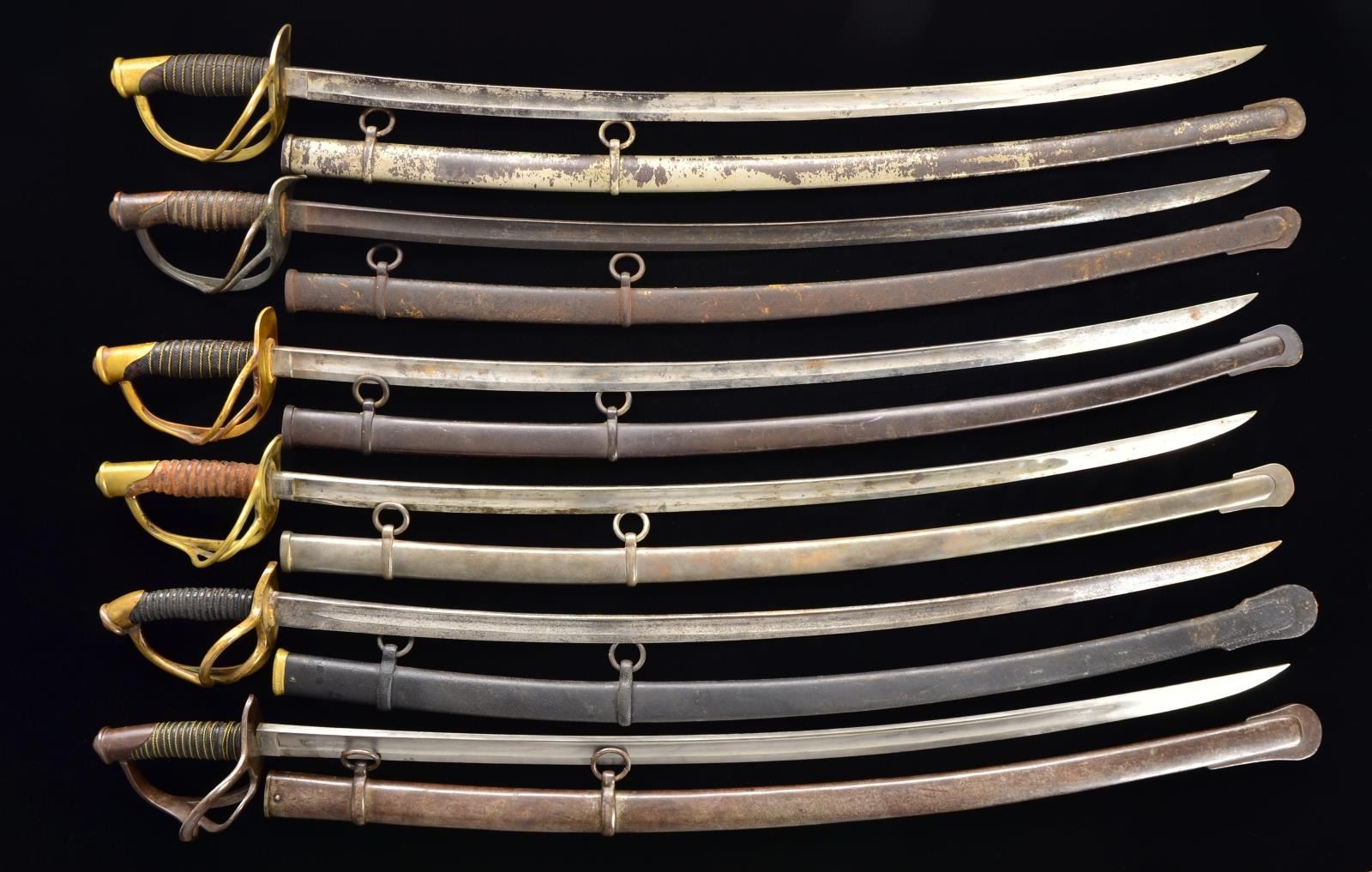 1) Horstmann cavalry officer’s saber, etched blade, sharkskin grip missing wire, decorated pommel & hilt. CONDITION: good overall, incorrect 1840 style enlisted scabbard. 2) 1849 Dated Ames Model 1840. CONDITION: very good to fine overall, blade is well marked w/ some original luster, scabbard cleaned bright. 3) Scarce Saurbier, Newark, NJ , distinctive heavy hilt w/ cocked pommel retained by spanner nut. CONDITION: good, gray blade, missing leather & wire wrap, scabbard painted black & gold. 4) Tiffany and Company import 1840 saber w/ iron hilt. CONDITION: good to very good overall, blade retains much original luster, “TIFFANY & CO” stamped on ricasso, hilt bent up at quillon, rib about 80% intact. 5 & 6) 2 Mansfield & Lamb 1860 sabers, 1 dated 1864, the other 1865. CONDITION: both good to very good overall. 7) B. J. Mallard, Clayville, NY 1862 dated Saber. CONDITION: very good overall, complete grip though leather has lost its shine, blade & scabbard show remnants of a flaking hard metal plating. 8) Roby 1863 dated saber, no scabbard. CONDITION: good overall, gray blade grip has no wire. 9-13) 5 Ames cavalry sabers, one 1862 dated is very good to fine overall w/ matching scabbard, the other 4 are average good condition, 3 w/ scabbards. (02-14223/JS). $2,400-3,200.