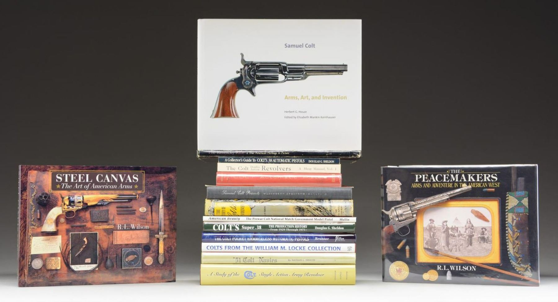 Lot consists of: 1) The Peacemakers: Arms and Adventure In the American West, by R.L. Wilson. 2) Steel Canvas: The Art of American Arms, by R.L. Wilson. 3) Colt Automatic Pistols (1896-1955), by Donald M. Bady. 4) The Colt Double Action Revolver: A Shop Manual, Vol. I, by Jerry Kuhnhausen. 5) A Collector's Guide to Colt's .38 Automatic Pistols, by Douglas G. Sheldon. 6) The Colt Pocket Hammerless Automatic Pistols, by John W. Brunner. 7) Colt's Super 38: The Production History, by Douglas G. Sheldon. 8) Colts from the William M. Locke Collection. 9) '51 Colt Navies, by Nathan L. Swayze. 10) A Study of the Colt Single Action Army Revolver, by Graham, Kopec, and Moore. 11) American Beauty: The Prewar Colt National Match Government Model Pistol, by Timothy J. Mullin. 12) Samuel Colt Presents a Loan Exhibition of Presentation Percussion Colt Firearms, by Cunningham, duMont, and R.L. Wilson. 13) The Story of Colt's Revolver, by William B. Edwards. 14) Samuel Colt: Arms, Arts, and Invention, by Herbert G. Houze. 15) The Kentucky Rifle: a True American Heritage in Picture. CONDITION: books show varying degrees of wear, with most being very good overall. Several books show some losses to their dust covers, but otherwise remain sturdy and serviceable. (02-20881-3/MLW). $500-1,000.