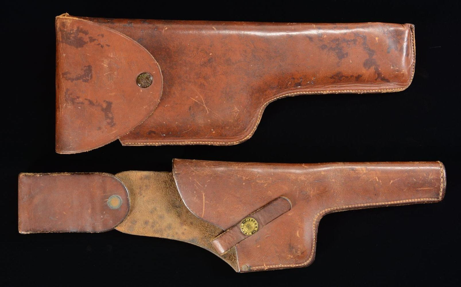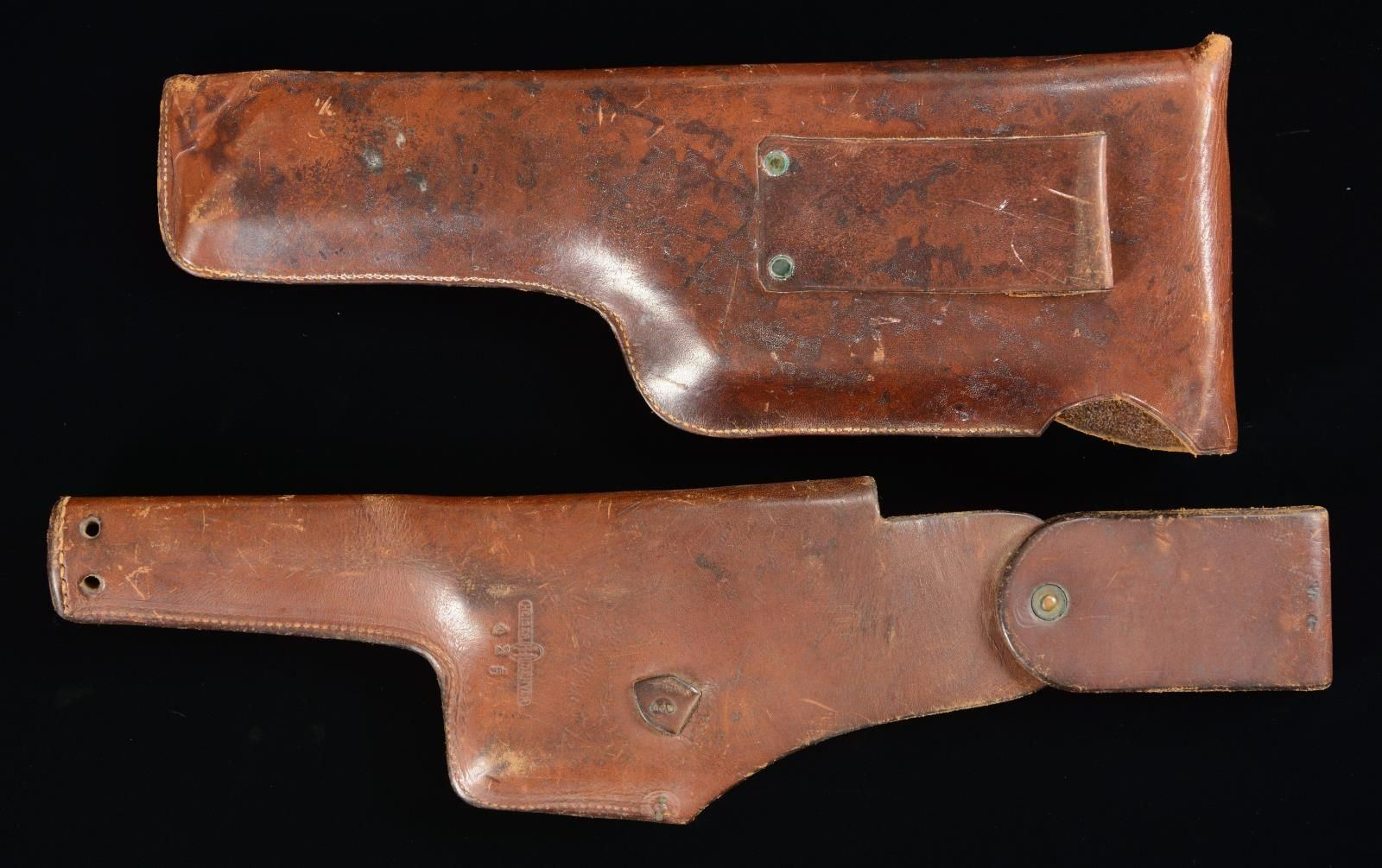 C96 HOLSTERS. 1) Brown leather C96 commercial swivel holster for 5 1/2" barrel C96 manufactured by Heiser. Rear of holster is stamped with the Heiser logo above "425". CONDITION: holster exhibits wear and marks from handling and storage overall, but otherwise remains sturdy and serviceable. 2) Large brown leather C96 commercial holster manufactured by Excelsior. Single belt loop on rear. CONDITION: holster exhibits wear, with some mild age related cracking and crazing overall. Button clasp on body is no longer present. (02-16946-4/MLW). $200-400.