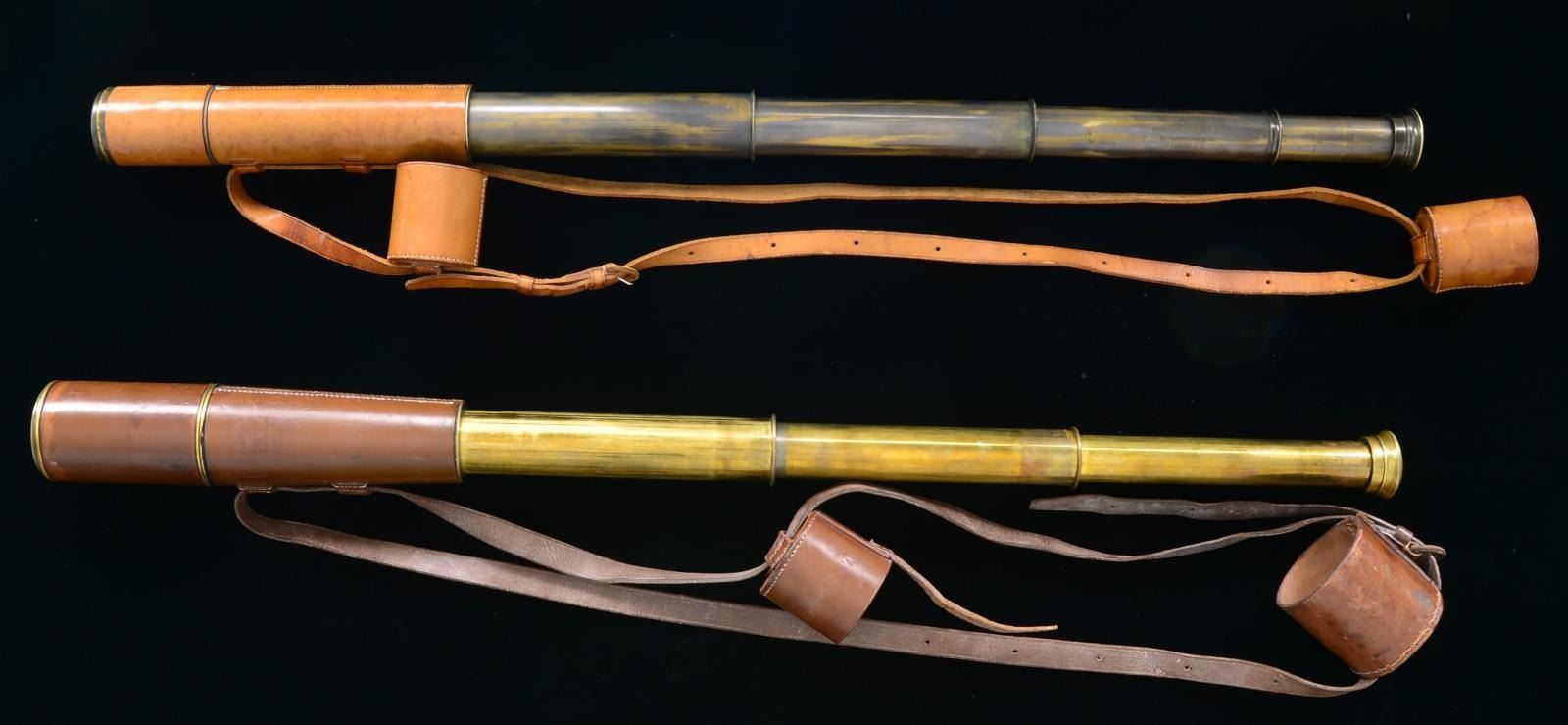 The larger of the 2 telescopes has military markings. Both telescopes have brass construction w/ leather covered bodies, sliding sunshades & leather lens caps retained by straps.