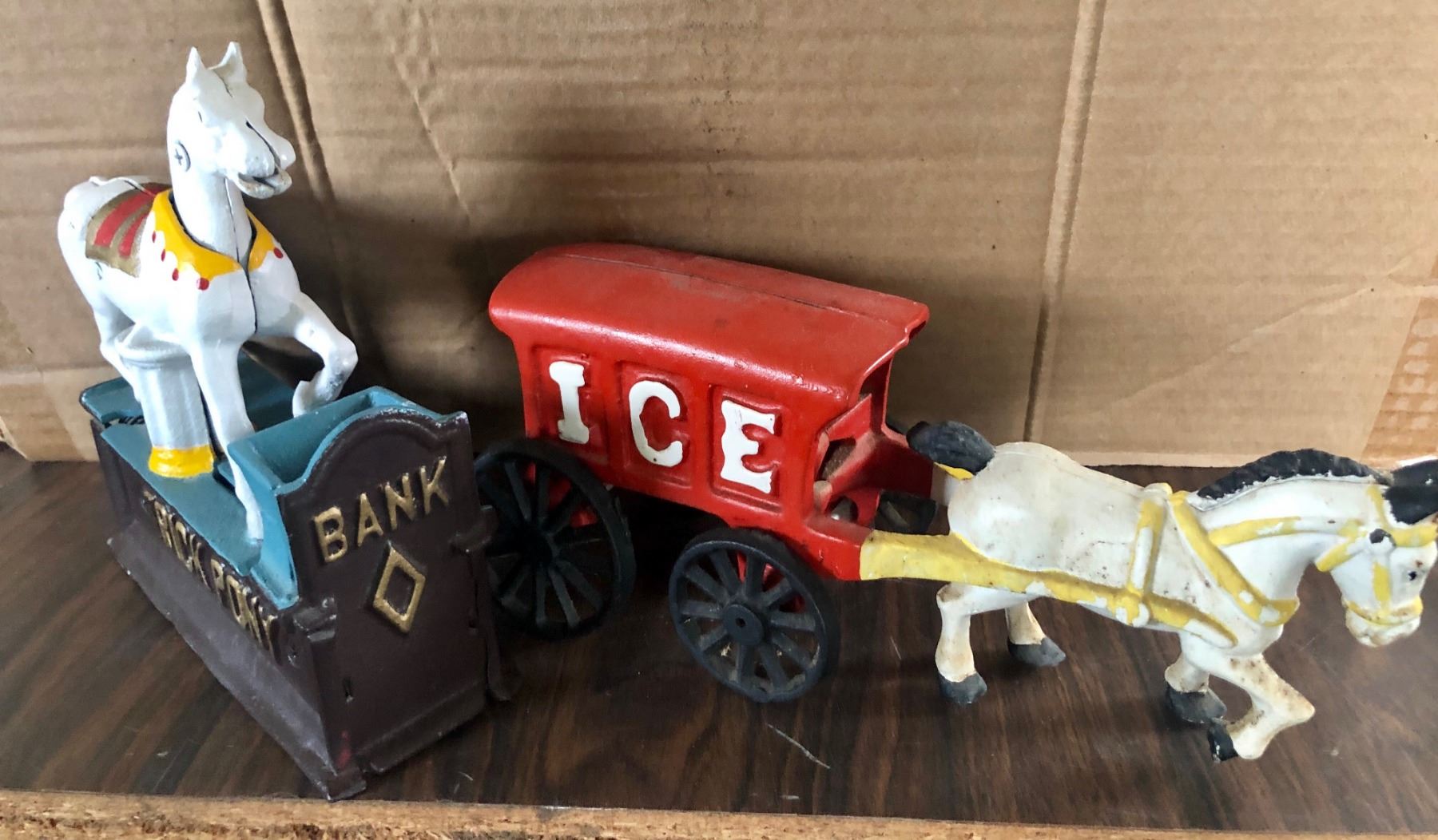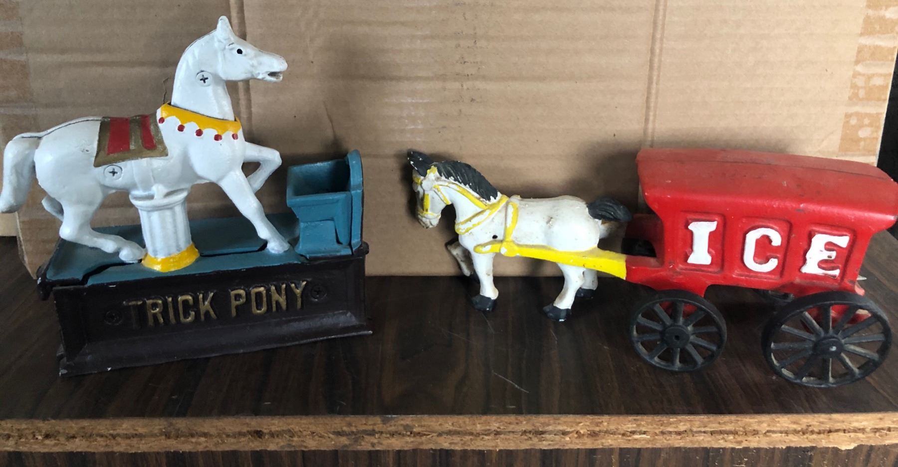 CAST TRICK PONY BANK AND HORSE AND WAGON