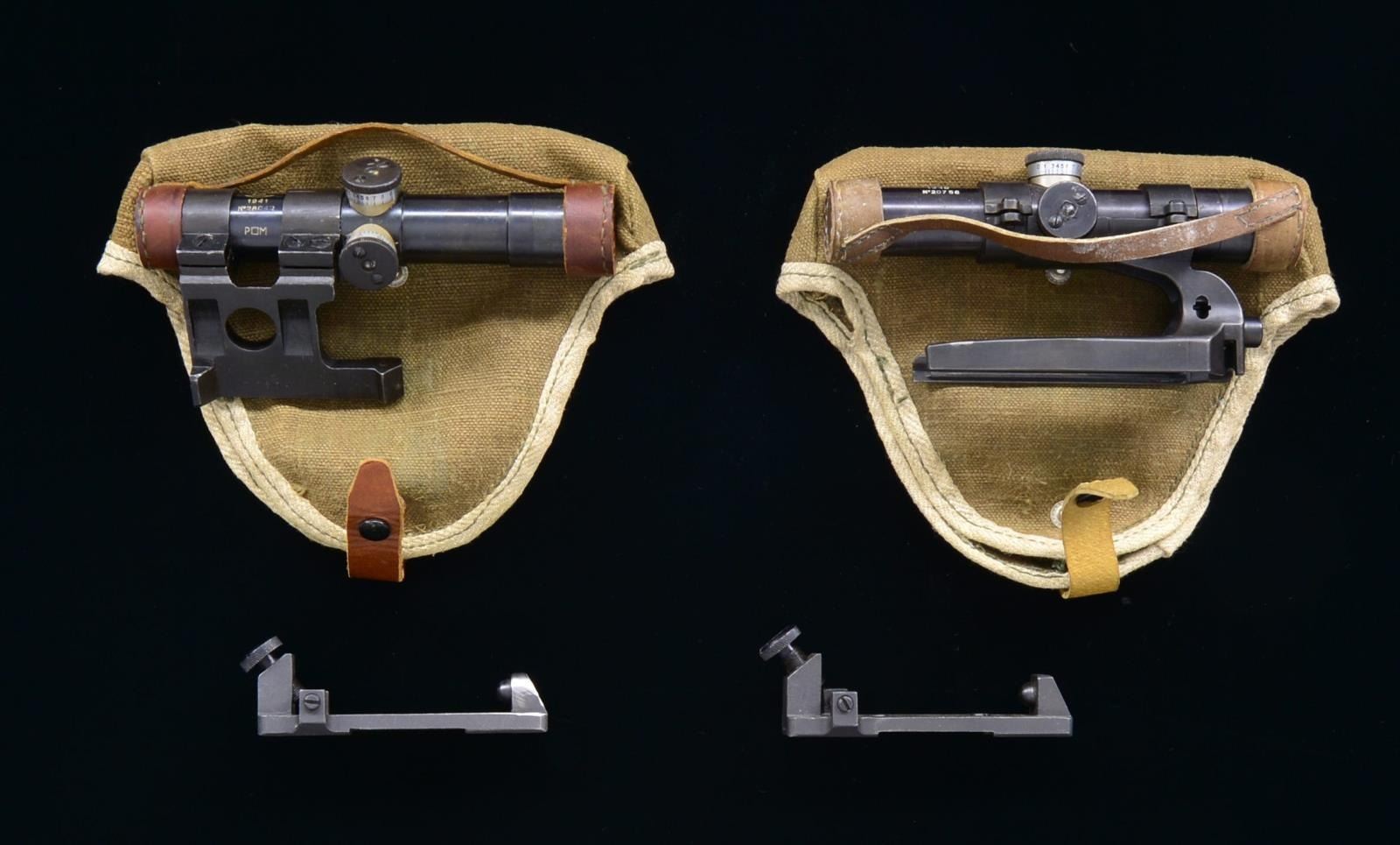 2) PU Telescopic sight. Steel tube. Marked on top w/ star, hammer / sickle & semi circle. Dated "1941", "NO 28042". "P" square "M" arsenal rebuild mark. 3.5 Power scope adj. for windage & elevation. Pointed post reticle w/ horizontal cross bars. Scope is fitted w/ blued steel side rail mt. Mt. marked w/ S# on left side which is reputed to be Polish practice. UNATTACHED ACCESSORIES: lot includes 2 mt. bases complete w/ knurled attaching screws. Green web scope cover & leather lens caps. CONDITION: scope retains 80% arsenal rework finish w/ light wear & scattered handling marks. Adjustments move freely. Optics appear clear & serviceable. Markings enhanced in white. Mt. retains lg. degree of arsenal rework finish w/ noted file fitting at rear of mt. Mt. bases have approx. 70% arsenal rework finish. 1 Mt. has area of missing finish at forward end. (02-16811-3/RW). $400-600.
