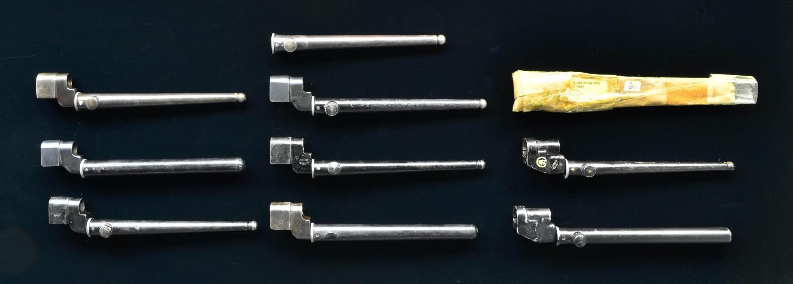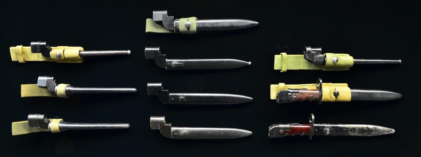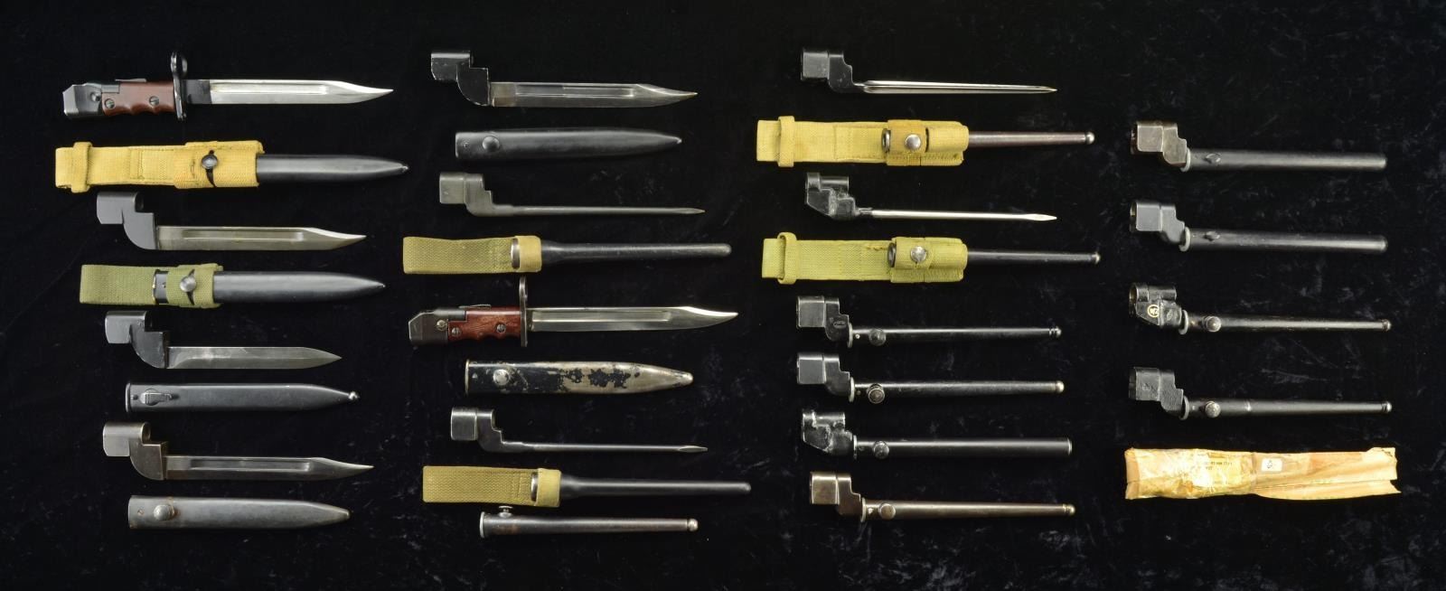 SCABBARDS FOR NO. 4 & NO. 5 RIFLES. An interesting assortment of knife & spike types all w/ scabbards; some w/ web frogs.