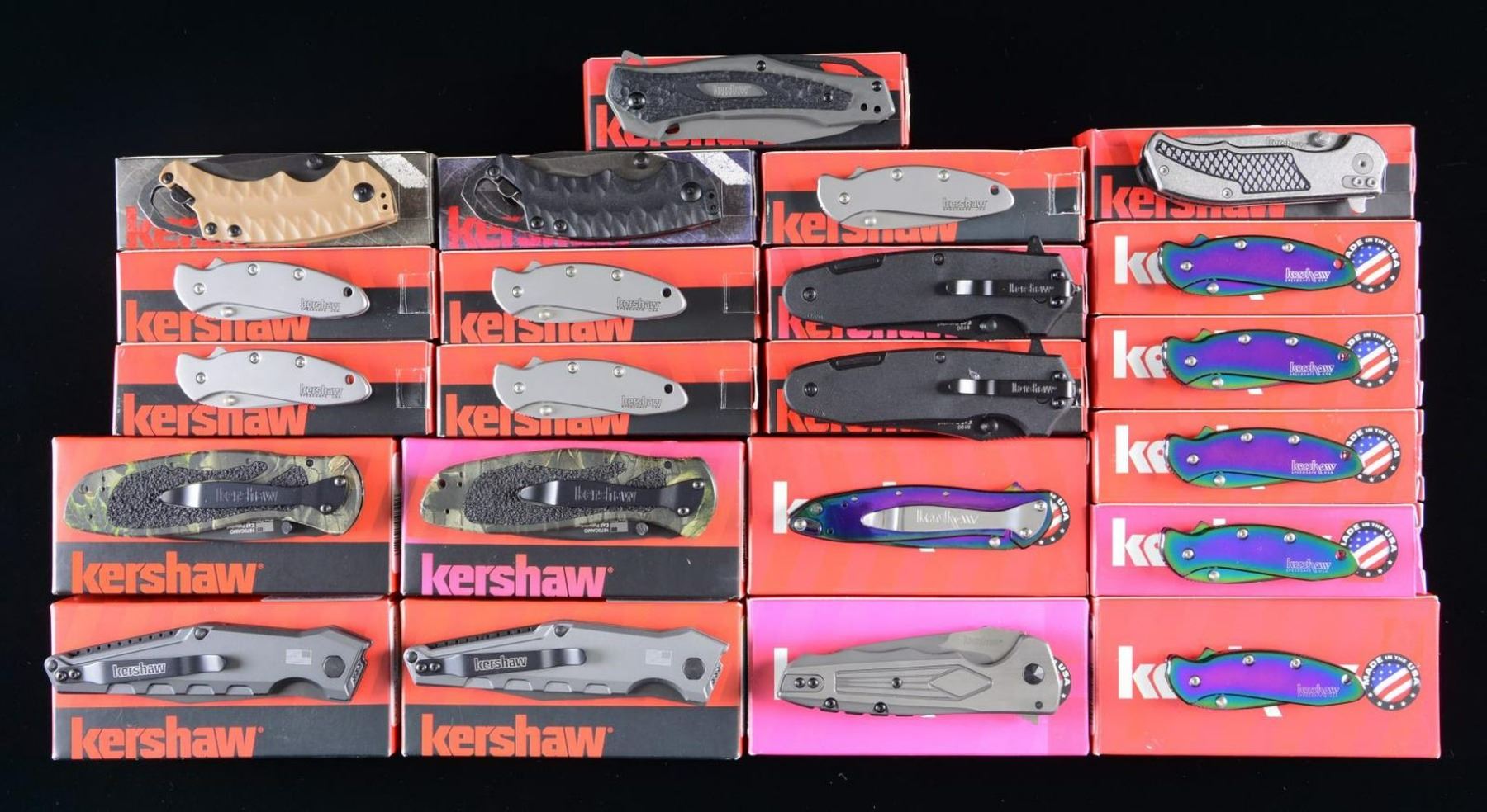 Knives are all folders in factory boxes with papers. Most appear to be assisted opening. The group of 22 knives consists of the following: 5 CHIVE model 1600. / 5 RAINBOW CHIVE model 1600VIB. / 2 Funxion EMT model 8100. / 2 Shuffle II Tan model 8750TTANBW. / 2 RAINBOW LEEK model 1660VIB. / 2 BLUR model 1670CAMO. / 2 LAUNCH 7 model 7900GRYBLK. / 1 Agile model 1558. / 1 Vedder model 2460. CONDITION: All knives are near new in box. PROVENANCE: The Collection of Gun Sport Ltd owned by Jon R. Thomas. (02-20780/RW). $900-1350.