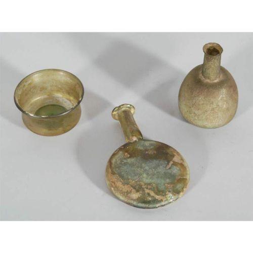 GROUP OF 3 ANCIENT ROMAN GLASS VESSELS including 6 7/8" flask, 5" bottle (chips) and 4" diameter bowl CONDITION REPORT: flask with one chip, bottle with many. PACKING AND SHIPPING: We offer packing (double boxed in most cases) and shipping of this item within the Continental United States by USPS or UPS (our choice- boxes over 30lbs or oversized may be recalculated based on buyer's location), NOT INCLUDING INSURANCE (it will be added when we know the sales price) for $30
