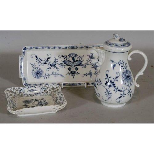 GROUP OF (3) BLUE ONION PIECES, bearing Meissen mark, largest 15" long, CONDITION REPORT: chip under lid of tea pot. PACKING AND SHIPPING: We offer packing (double boxed in most cases) and shipping of this item within the Continental United States by USPS or UPS (our choice- boxes over 30lbs or oversized may be recalculated based on buyer's location), NOT INCLUDING INSURANCE (it will be added when we know the sales price) for $40