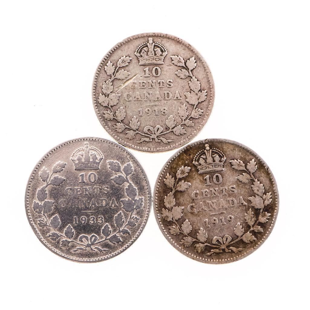 GROUP OF 3 CANADA HISTORICAL SILVER 10 CENTS - 1918,1919,1933