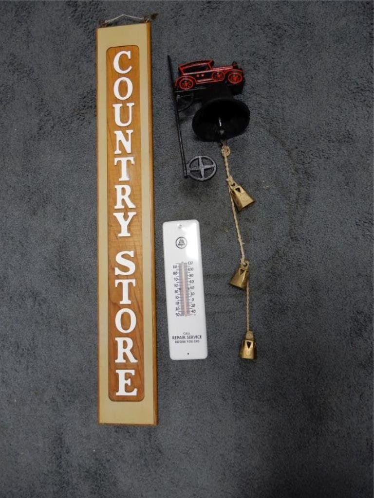34 1/4" X 5" DSWOODEN SIGN - BELL CANDA TIN THERMOMETER - CAST BELL