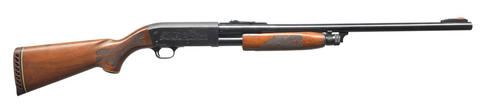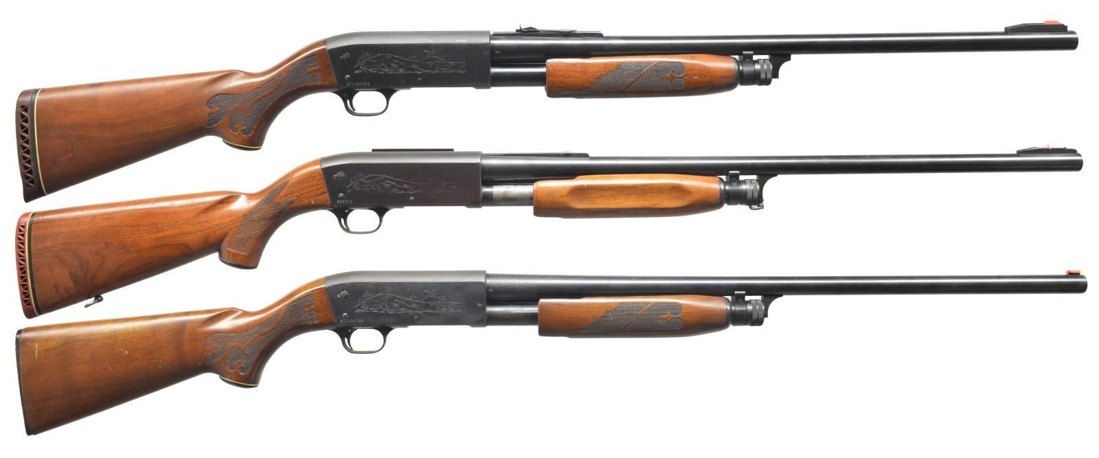 1) 37 DEERSLAYER. Cal. 12 Ga. S# 371382562. Bbl. 25". Screw on ramp front orange blade sight & dovetail adj. rear sight. Standard checkered forend. Fleur de lis checkered pistol grip w/ black Ithaca marked grip cap & brown vented Ithaca recoil pad. Receiver has standard Ithaca roll engraving. This is a fully rifled bbl. w/ 3" chamber. CONDITION: bbl. retains very good original blue w/ some minor muzzle wear. Receiver retains a good original blue w/ some minor scuffing on top. Forend has original finish w/ a few light scratches. Buttstock has original finish w/ a few minor scratches. Good checkering. Bore is good. (20-3474/BT). 2) 37 FEATHERLIGHT. Cal. 12 Ga. S# 371154785. Bbl. 26" plain w/ 2 3/4" choke. Ray bar front sight. Standard roll engraved receiver. Checkered forend. Fleur de lis checked pistol grip w/ black grip cop marked “ITHACA” & Ithaca gun hard rubber buttplate. CONDITION: bbl. retains original blue w/ minor surface oxidation over chamber. Receiver retains original blue w/ surface oxidation across top & down left side at front of receiver. Forend has original finish w/ minor handling marks & good checkering. Buttstock has original finish w/ some minor handling marks & good checkering. Bore is good. (20-3478/BT). 3) 37 FEATHERLIGHT DEERSLAYER. Cal. 12 Ga. S# 862312. Bbl. 26". Screw on ramp w/ orange front sight & blank dovetail rear sight. Receiver has standard roll engraving & 2 drilled holes on right side for a receiver sight. Receiver has Weaver side mount attached. Uncheckered finger groove forearm. Checkered pistol grip stock w/ black grip cap & Ithaca red vented recoil pad. Sling swivels installed. CONDITION: bbl. retains good original blue toning w/ some brown patina & areas of fine surface oxidation. Receiver has original blue mixing w/ brown patina & some fine surface oxidation. Forend has original finish w/ some minor handling marks. Buttstock has original finish w/ a repaired chip lower right side, also a grain crack center right side at receiver. Hand wear in grip area. Good checkering. Smooth bore bbl. is good. (20-3482/BT). ALL MODERN. $1,200-1,600.