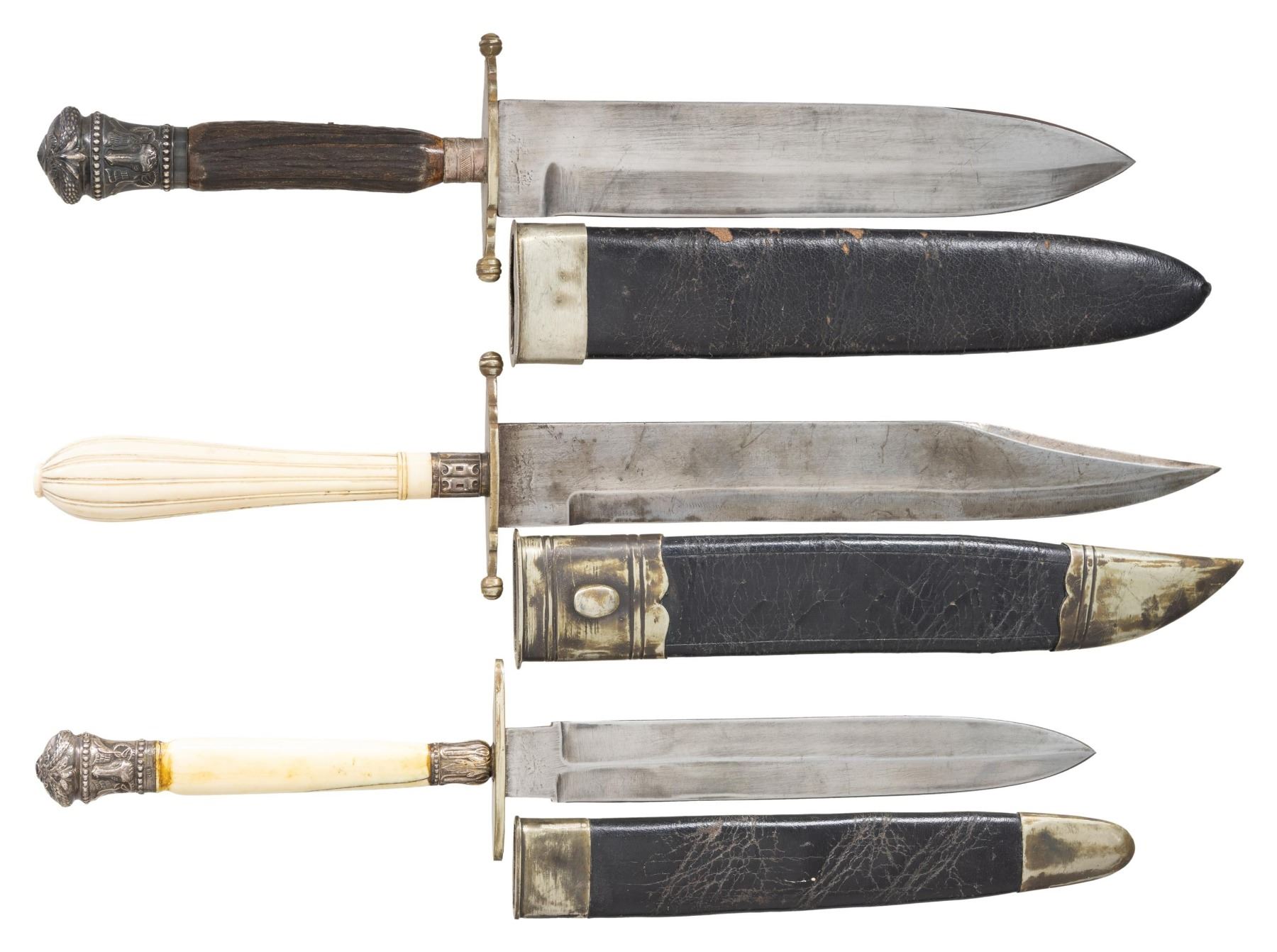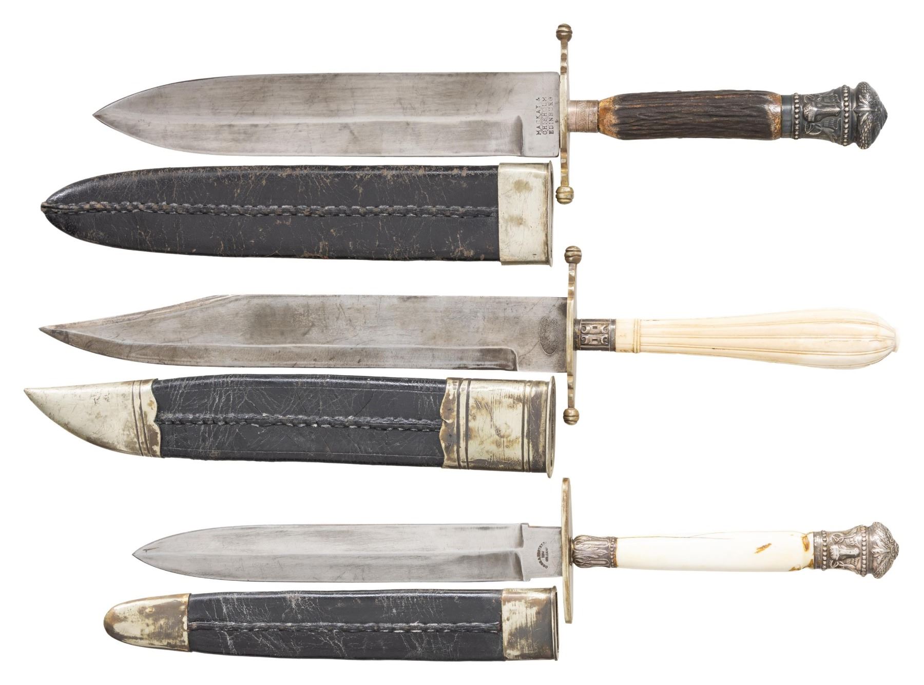Knives have 9" to 10.5" blades, one clip point, one wavy, 2 spearpoints, fake markings "TIFFANY", "COOK & BROS", & "MACKAY & CHISHOLM", each made with vintage cutlery handles, cross guards and blades are recent manufacture as are German silver mounted leather sheaths. CONDITION: fine overall. (02-24821, 02-24823, 02-24824/JS). NON-GUN. $300-500.