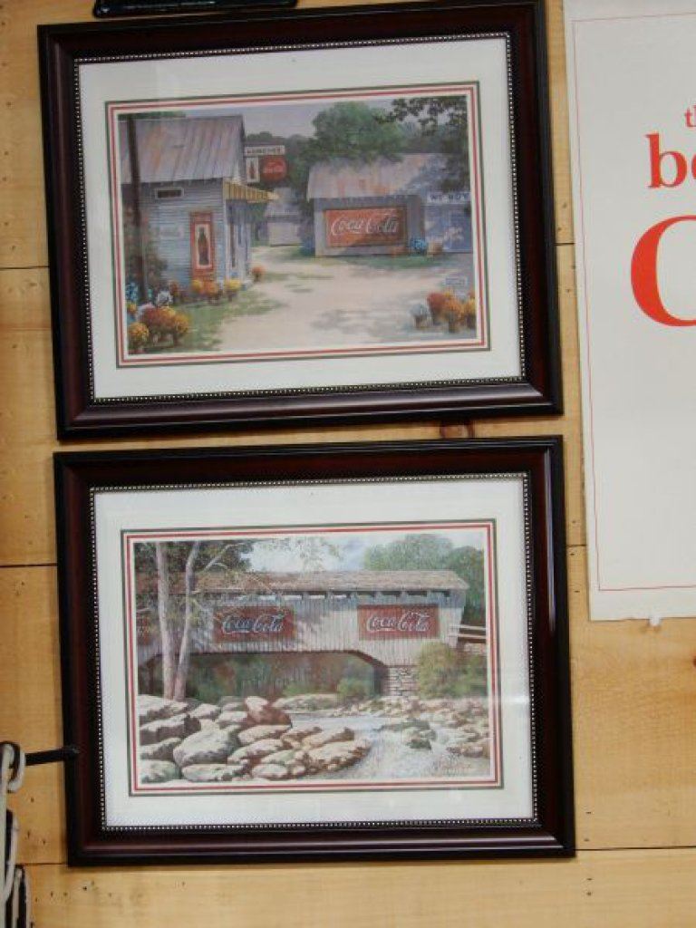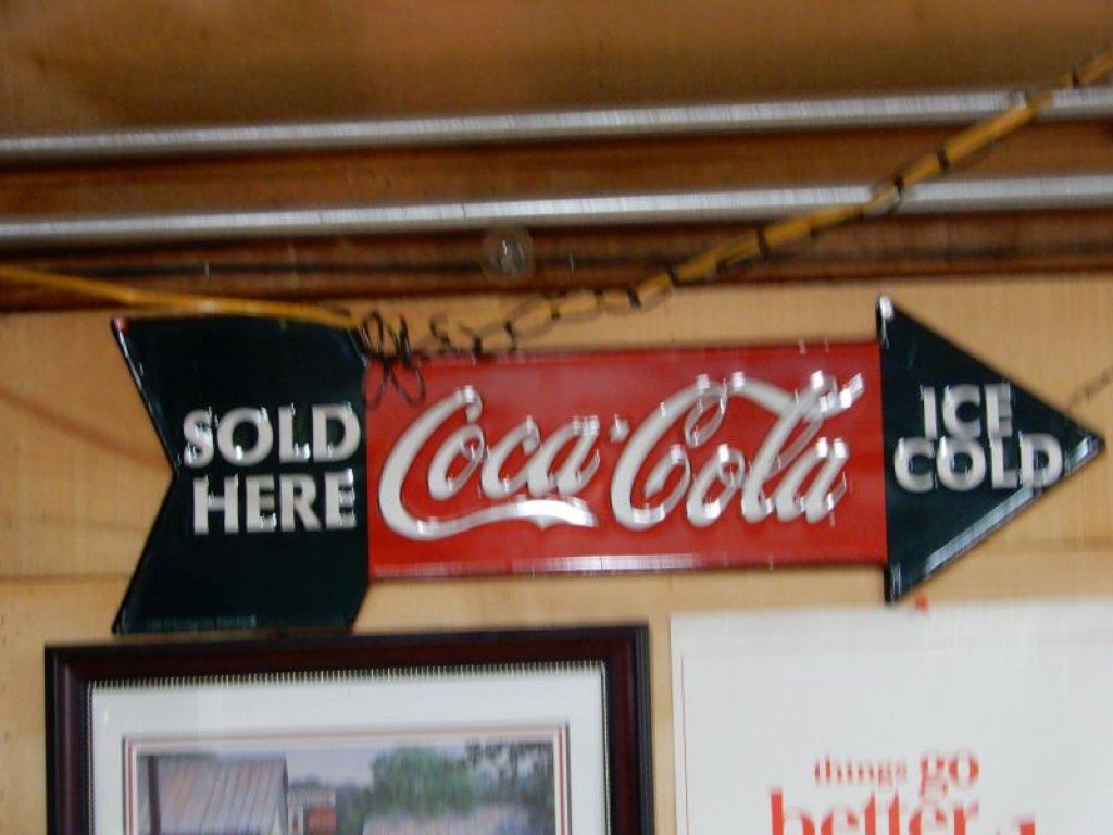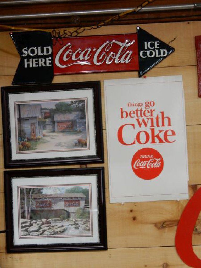 GROUP OF 4 COCA-COLA ADVERTISING EMBOSSED SST ARROW SIGN - 2 FRAMED PICTURES - CARDBOARD ADVERT LOCATION: UPPER RIGHT