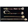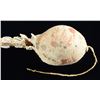 CLUBS. 1) 22" overall, 3.5" double pointed central grooved well patinaed stone head, dyed horsehair cord wrap attached to wooden handle with dyed horsehair cord wrapped handle, dyed horse hair decoration at base and top, good to very good overall. 2) 24" overall, 3" central grooved polished stone head that is well patinaed with one side exposed faceted crystal matrix of stone, attached to a wooden handle with rawhide wrapping as is the handle wrapped; good to very good overall. 3) 28" overall, 3" leather covered smooth stone originally attached to leather wrapped wood handle with bead and painted decoration. Attachment of leather wrapped stone in precarious and no longer firm; poor overall. 4) 23" overall, detached hollow painted 3" hardened leather ball shaped top, wood handle is broken off inside the once attached top, shows age, collection number on the leather top, wood handle is wrapped in trade cloth and beads which are coming loose; poor overall. PROVENANCE: Martin Lane Historic & Western Americana Lifetime Collection. (02-21470/JS). $600-800.