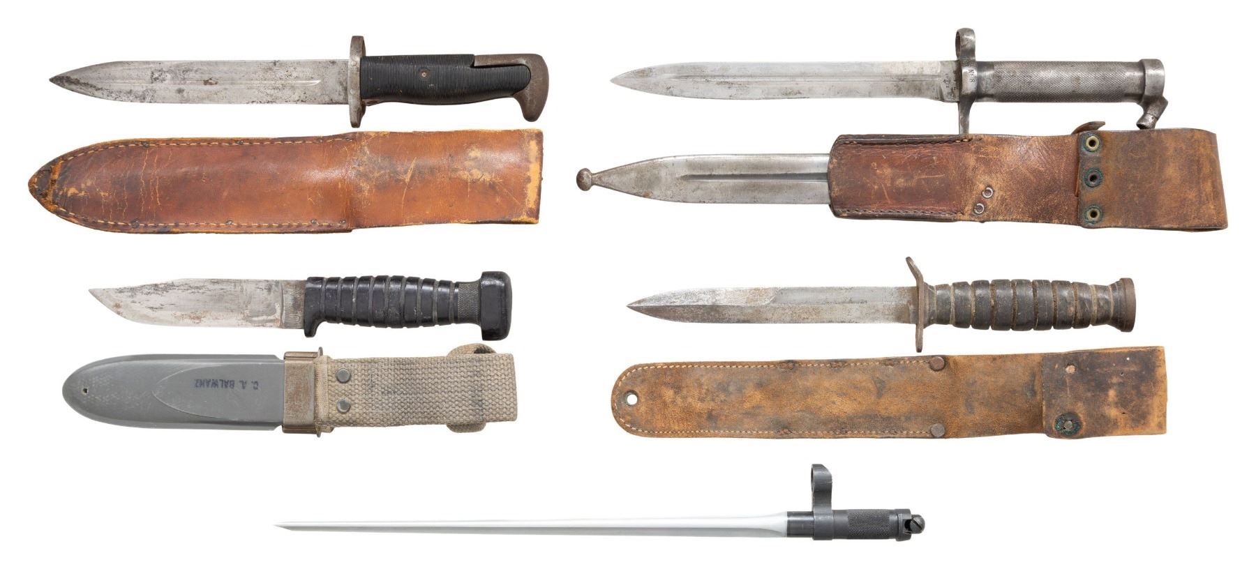 1) SKS folding spike bayonet. 2) Swedish M1896 bayonet, scabbard & frog. 3) COLONIA USN MARK I knife with scabbard. 4) Handmade WWII theater knife appearing to be made from M1 Garand bayonet with handmade sheath. 5) WW2 Knife & Sheath similar to US M3 knife. CONDITION: knifes are in fair to good overall condition showing oxidation, marks & patina. Leather shows heavy wear & cracking. (02-24144-1/MD). $200-300.