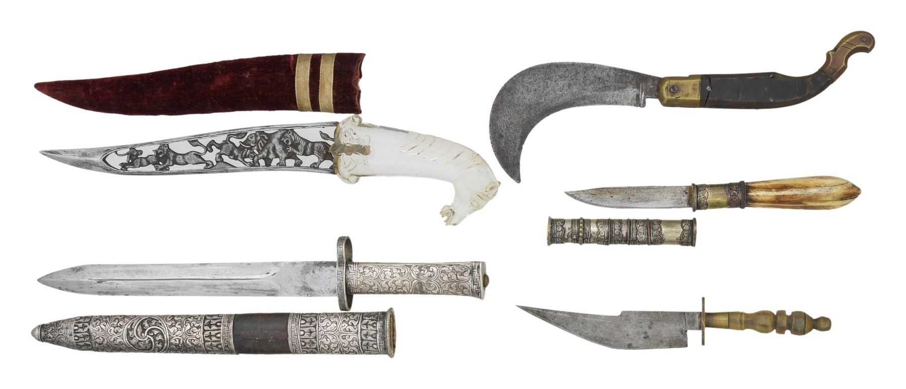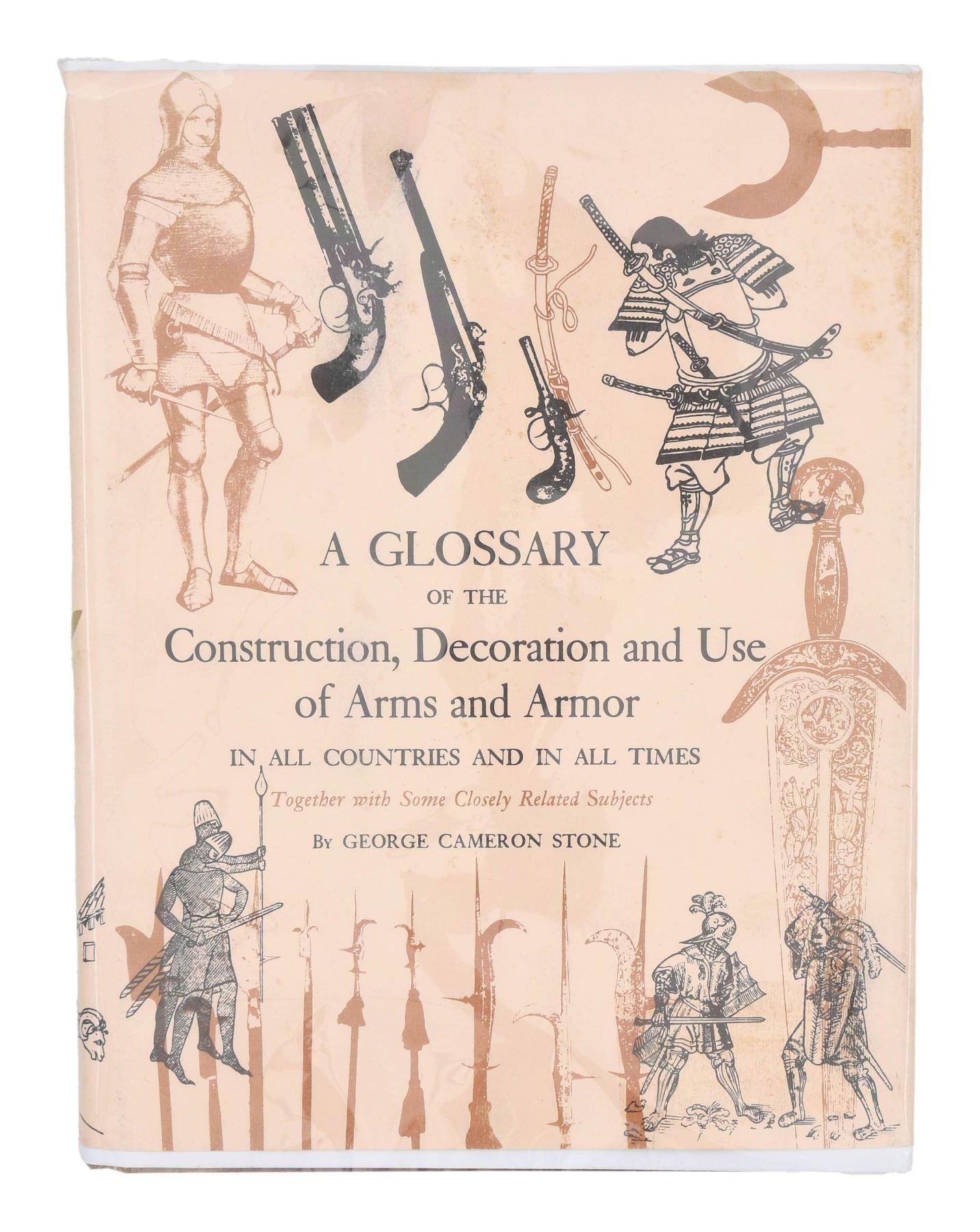 Silver mounted dress bayonet, 10.25" spearpoint blade; clear glass horse head handled souvenir dagger, 9.5" cut-out animal blade; horn & brass 5" hooked blade folder; tapered octagonal polished bone handled 4" bladed knife with cylindrical sheath; brass & horn handled small 5.5" bladed bowie. "Stone’s Glossary" Is the classic text on ethnic and ancient arms and accoutrements. It was originally published in 1934 and this is a 1961 addition, 694 pages illustrating and describing over 10,000 items including knives. CONDITION: good overall. PROVENANCE: Estate Collection of Dr. Curtis S. Morse. (02-25281/JS). NON-GUN. $400-800.