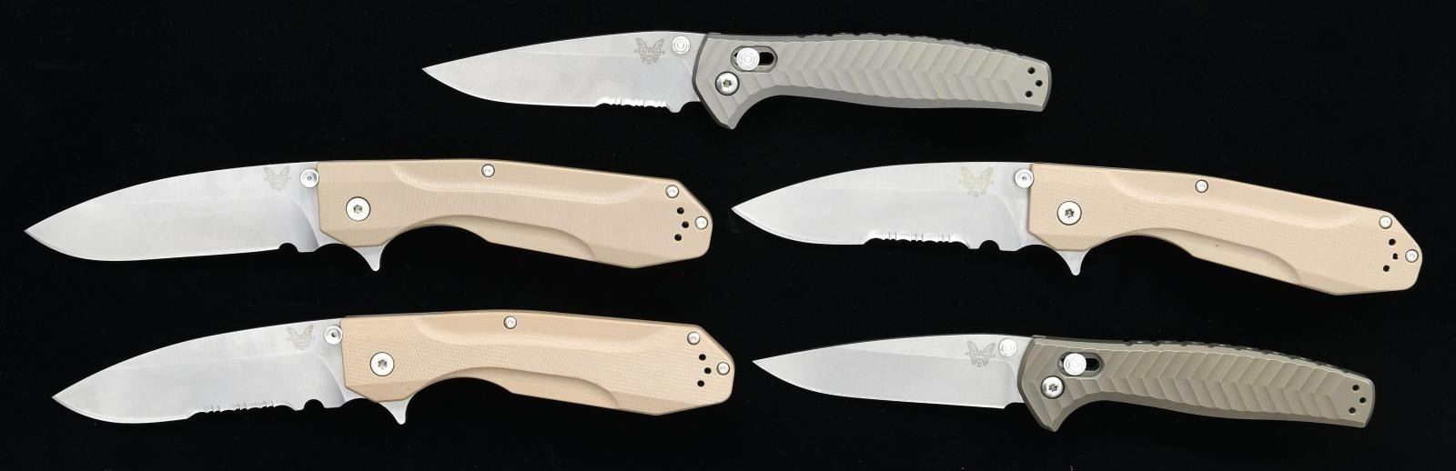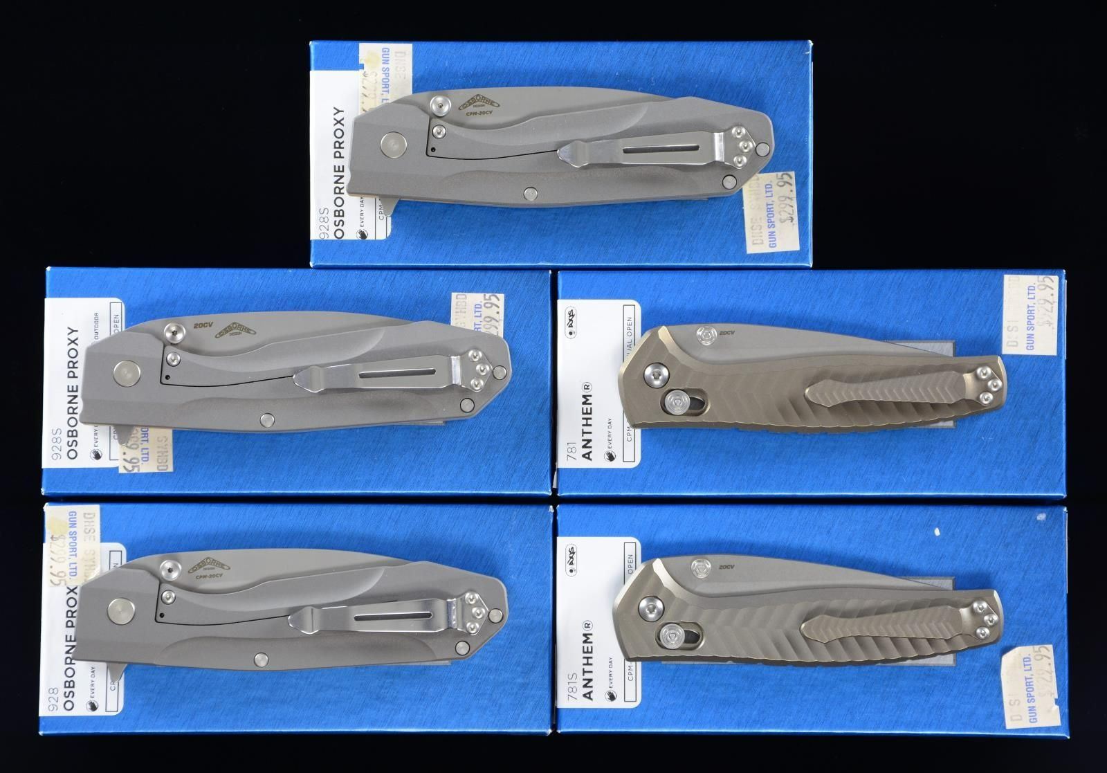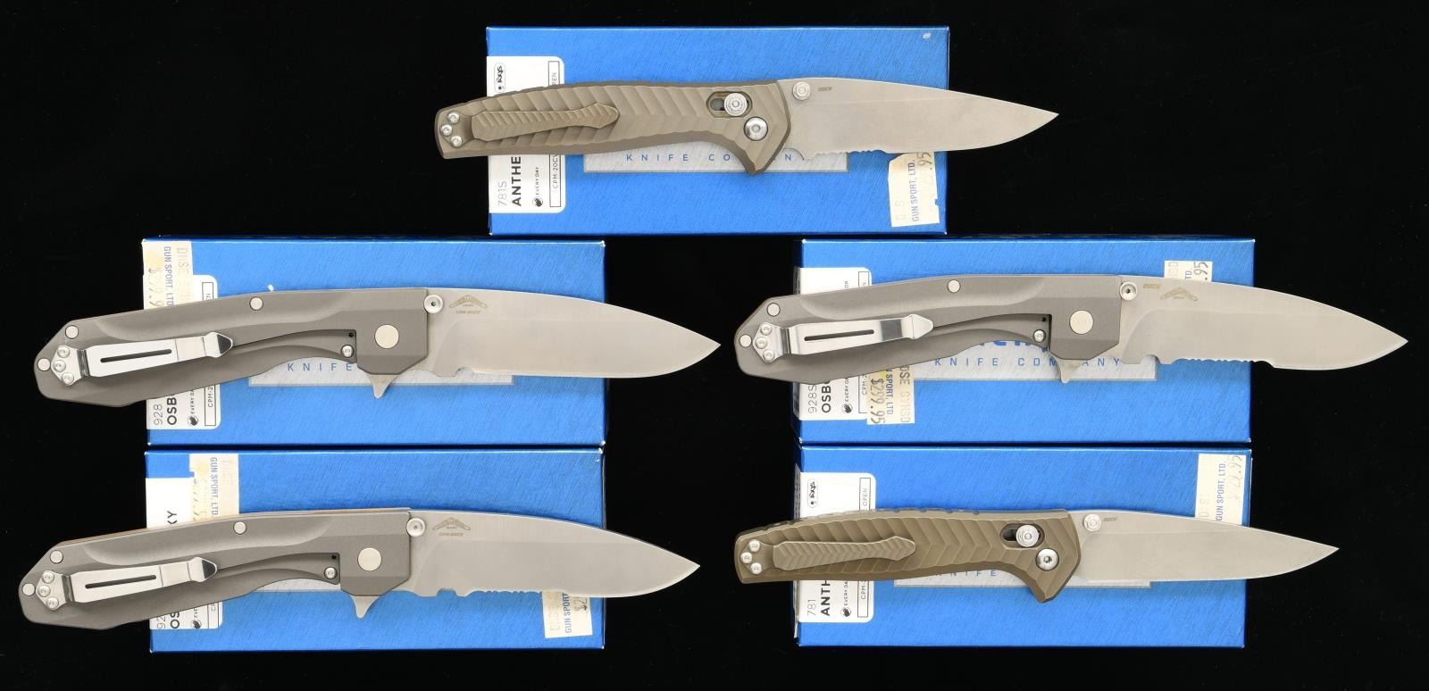 KNIVES. These Manual Open BenchMade knives are all in blue factory boxes, have protective cloth bags and instruction papers. 1) 1 - 781 ANTHEM EVERYDAY CPM-20CV knife w/ 3 1/2" single edge blade. Left side marked w/ BenchMade logo. Right side marked w/ "20CV". Bronze colored alloy grip w/ belt clip. 2) 1 - 781S ANTHEM EVERYDAY CPM-20CV knife w/ 3 1/2" partially serrated blade. Left side w/ BenchMade logo. Right side w/ "20CV". Silver colored alloy Chevron patterned handle. 3) 2 - 928S EVERYDAY TACTICAL OUTDOOR CPM-20CV knife w/ 3 3/4" partially serrated blade. Left side w/ BenchMade logo. Right side has "20CV" & Osborne logo. Gray & tan composite grip w/ belt clip. 4) 1 - 928 OSBORNE PROXY EVERYDAY TACTICAL OUTDOOR CPM-20CV knife w/ 3 3/4" blade marked on left w/ BenchMade logo. Right side marked w/ Osborne logo & "CPM-20CV". Tan & gray composite grip. CONDITION: near new in factory boxes. PROVENANCE: the Collection of Gun Sport Ltd. owned by Jon R. Thomas. (02-20783-4/RW). $800-1,200.