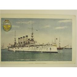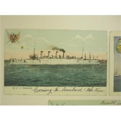 GROUP OF 5 EARLY 20TH CENTURY NAVAL POSTCARDS. Color postcards feature warships from U.S.'s naval fleet in the early 20th century. Featured ships are the U.S.S. Massachusetts, U.S.S. Kentucky, U.S.S. Columbia, & U.S.S. Pennsylvania. Three are postmarked 1906, one is postmarked 1907, and one is postmarked illegibly. Four are marked on reverse "Illustrated Postal Card Co. New York-Leipzig" and one is published by the Jamestown Amusement & Vending Co., Inc., Norfolk, Va.