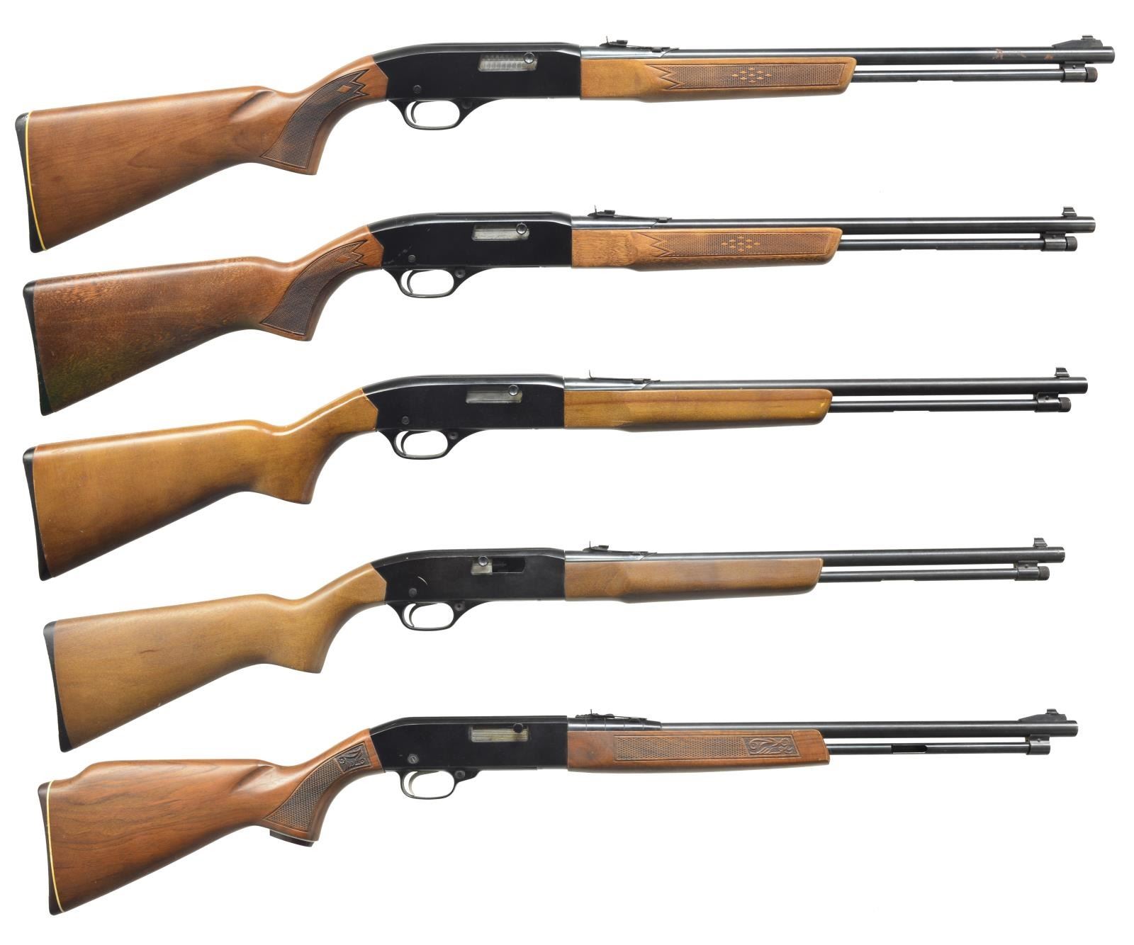 1) 290. Cal. 22 LR. S# B1923015. Bbl. 20 1/2". Ramp w/ dovetail bead front sight & dovetail adj. rear sight. CONDITION: bbl. has original blue w/ sm. amount of surface rust on right side at muzzle. Receiver has original black w/ minor thinning on sharp edges. Forend has original finish w/ minor handling marks. Buttstock has original finish w/ a couple of dings in grip area. Good Checkering. Bore is good. (20-3420/BT). 2) 190. Cal. 22 LR. S# B2163197. Bbl. 20 1/2". Dovetail bead front sight & dovetail adj. rear sight. Checkered forend. Checkered pistol grip w/ Winchester hard rubber buttplate. CONDITION: bbl. has good, original blue w/ some minor rust spots at muzzle. Receiver has original black finish w/ wear on sharp edges & a scratch on left side. On bottom near S#, someone has scratched in the letters “FTM” & “DT”. Forend has original finish w/ minor handling marks. Buttstock has original finish w/ a couple of light scratches. Bore is good. (20-3421/BT). 3) 190. Cal. 22 LR. S# B1717765. Bbl. 20 1/2". Dovetail bead front sight & dovetail adj. rear sight missing elevator. Uncheckered forend. Uncheckered pistol grip stock w/ Winchester hard rubber buttplate. CONDITION: bbl. retains very good, original blue w/ few areas of fine surface oxidation. Receiver has original black w/ minor scratches. Forend has original finish w/ a sm. dent forward left side. Buttstock has original finish w/ some flaking on sharp edges & some light scratching. Bore is good. (20-3422/BT). 4) 190. Cal. 22 LR. S# B1732200. Bbl. 20 1/2". Dovetail bead front sight & dovetail adj. rear sight. Uncheckered forend & uncheckered pistol grip stock w/ Winchester hard rubber buttplate. CONDITION: bbl. retains original blue w/ areas of fine surface oxidation. Receiver has original black w/ minor nicks & dings across top as well as a few minor scratches. Forend has original finish w/ a couple of handling marks. Buttstock has original finish w/ some minor handling marks & a couple of chips of wood at buttplate. Bore is good w/ minor pit near muzzle. (20-3423/BT). 5) TED WILLIAMS 3T. Cal. 22 LR. S# R151814. Bbl. 20 1/2". Ramp w/ bead front sight & dovetail adj. rear sight. Checkered forend. Checkered pistol grip stock w/ elaborate grip cap & brown hard rubber buttplate w/ white line spacer. There is no mag. tube. CONDITION: bbl. retains good original blue w/ some minor muzzle wear. Receiver has original black finish w/ minor wear on shark edges & a couple of faint scratches. Forend has original finish w/ a few handling marks & good checkering. Buttstock has original finish w/ a few nicks & dings as well as good checkering. Bore is very good. (20-3424/BT). ALL MODERN. $750-1,000.