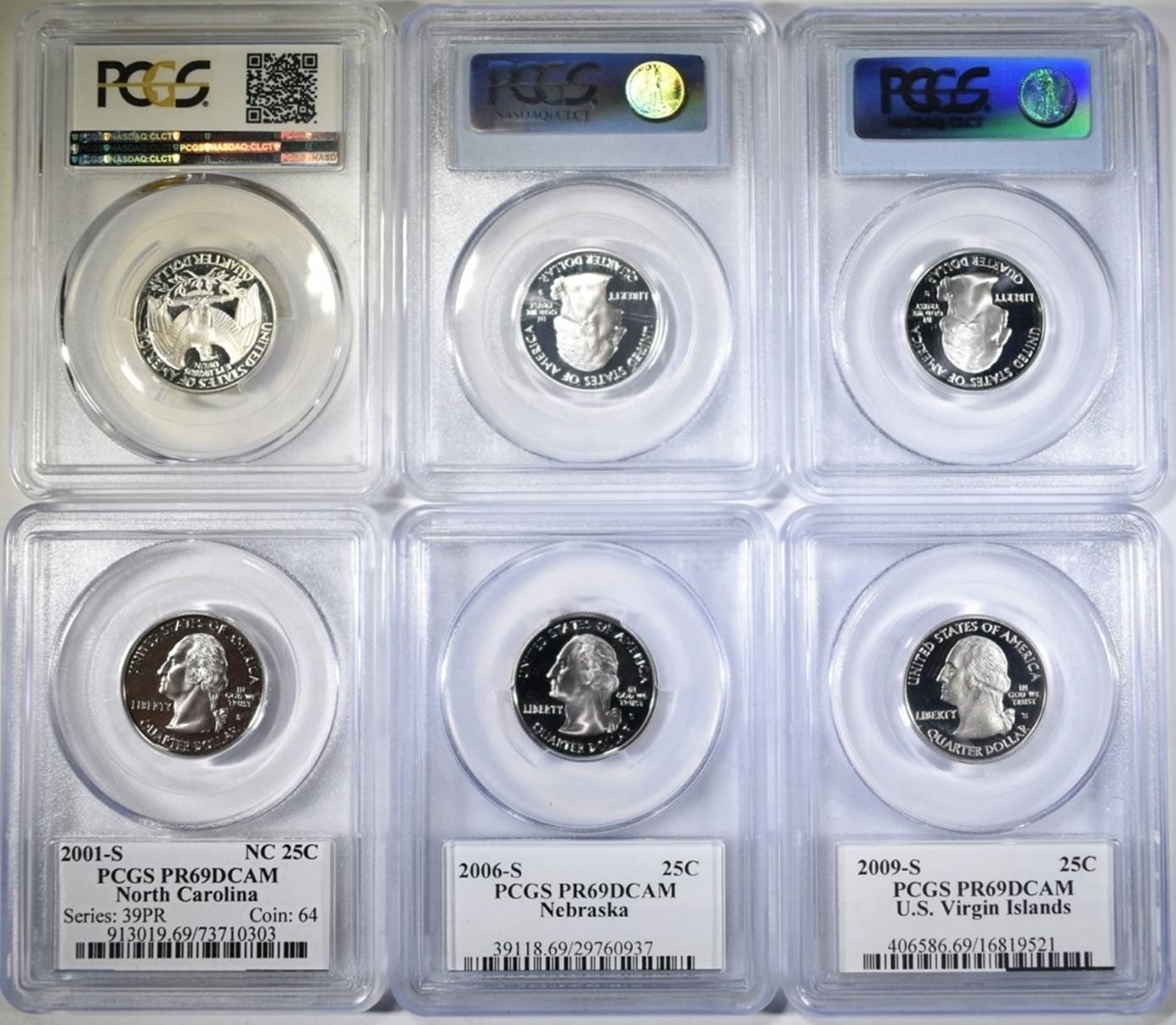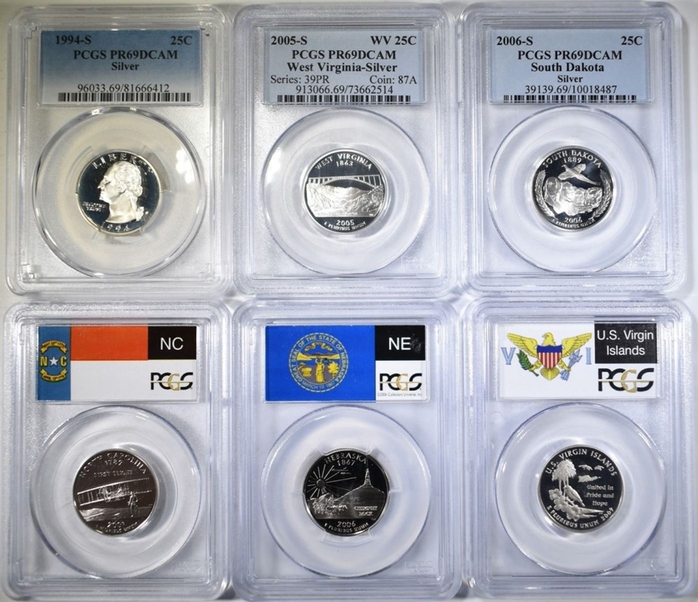 1994-S PR-69 DCAM SILVER WASHINGTON, 2005-S WV & 2006-S SD PR-69 DCAM SILVER, 2001-S NC, 2006-S NE & 2009-S U.S. VI PR-69 DCAM. ESTIMATE $110 - $130.