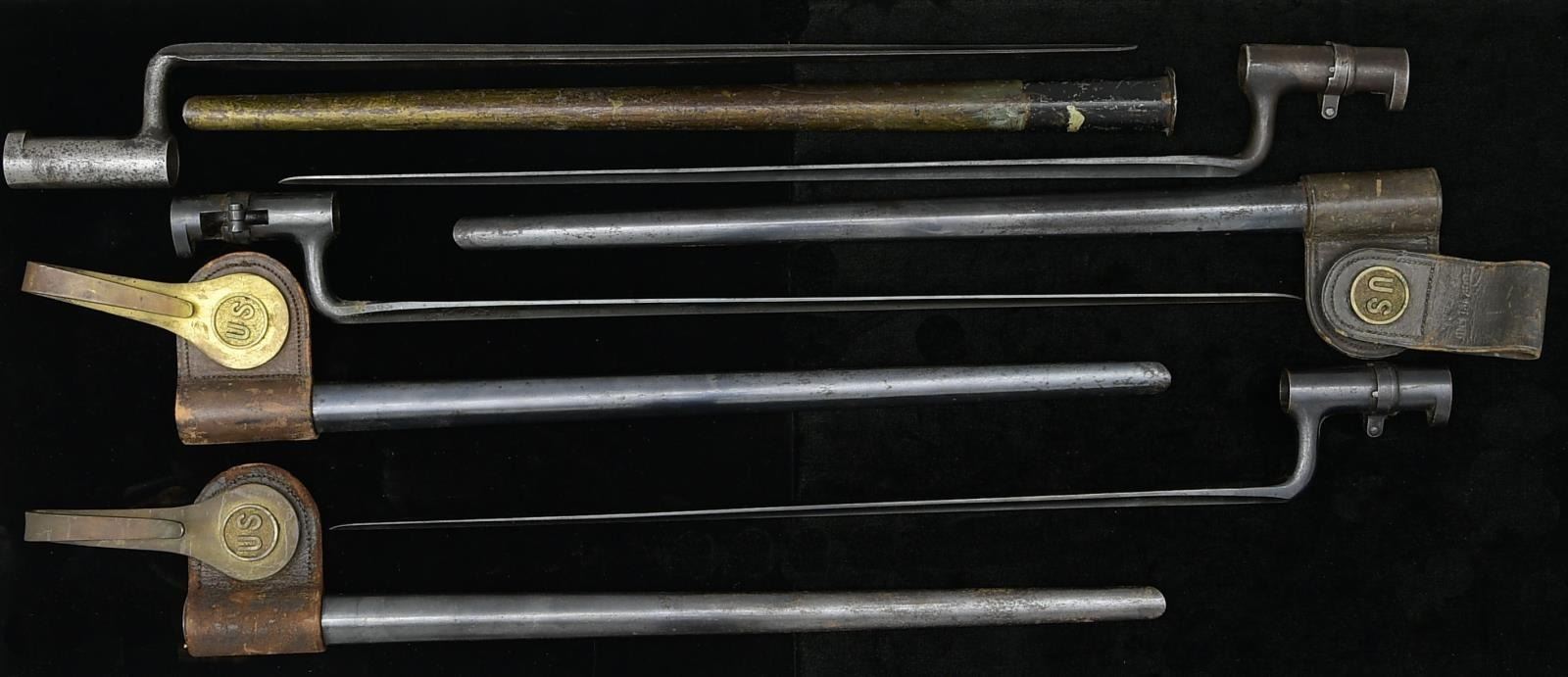 1) 2 - US Model 1873 Pennsylvania National Guard bayonets w/ 18" triangular blades marked on top "U.S.". Lock rings are present. Steel scabbards w/ leather frogs. Black leather frogs have loop type belt attachment. Brass disks are marked "N.G.P." indicating use by the Pennsylvania National Guard. 2) 2 - US Model 1873 18" triangular blade bayonets. Blued steel blades are marked "U.S." on top. One has additional tiny "S" marking. Locking rings are present. Blue steel scabbards w/ brown leather frogs. Brass belt hooks marked "U.S." in center. 3) 2 - US Model 1873 socket bayonets w/ 18" blades. One bayonet is blue & 1 is gray & patina. Locking rings are present. Blades are marked "U.S." on top. Blued steel scabbards w/ brown leather frogs equipped w/ belt loops. Brass disks are marked "US". Leather loops have faint arsenal markings. 4) 18" triangular blade. US Model 1862. Hewes & Phillips conversion. "T Mortise Cut." w/out lock ring. 3" socket. Blade is marked on top "U.S.". Incorrect steel scabbard w/out frog. CONDITION: bayonets range from fair to good in overall condition but some have greater amount of original blue than others w/ wear, oxidation & areas of fine pitting. Scabbards are similar in condition but may have sm. vents & generally less finish. Leather frogs have wear, scuffing & flexing. Brass parts have staining & patina. PROVANANCE: from the Estate Collection of Thomas J. Mulligan. (02-19734-8/RW). $250-450.