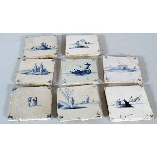 GROUP OF (8) DUTCH TILES, each 5"x5", 18th century, CONDITION REPORT: all with chipping, one broken and reglued. PACKING AND SHIPPING: We offer packing (double boxed in most cases) and shipping of this item within the Continental United States by USPS or UPS (our choice- boxes over 30lbs or oversized may be recalculated based on buyer's location), NOT INCLUDING INSURANCE (it will be added when we know the sales price) for $40
