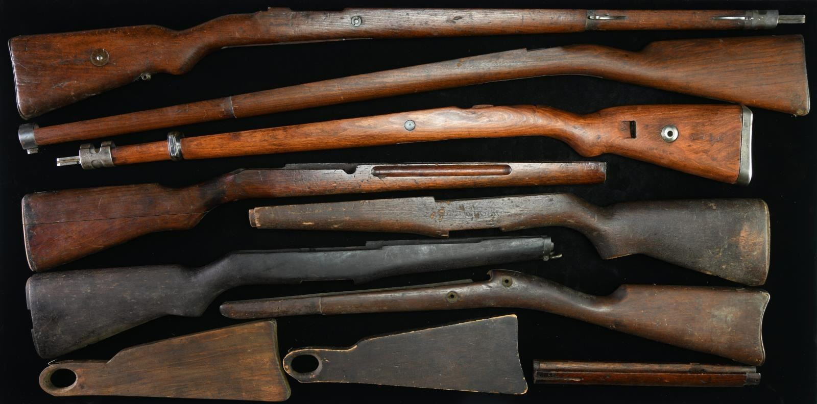 1) Imperial German Gewehr 98 stock. Flat metal buttplate with unmarked stock disk. Buttplate is stamped with a "6" over "R" and the serial number. CONDITION: stock shows scattered marks from handling and storage, but otherwise remains sturdy and serviceable. 2) German WWII K98k stock. Russian captured, refurbished, and renumbered on the left side of the butt. Right side of butt bears a faint Eagle/H Heer acceptance proof. Interior of stock is stamped "Kr 7 15 41" indicating manufacture on July 15th of 1941. Repair/replacement material is present the the rear of the receiver tang. Cupped buttplate with milled rear and front bands. CONDITION: very good as refurbished, with some scattered marks from handling and storage. metal components show wear and some mild oxidation. 3) Spanish Mauser stock with faint naval "MA" proof on right side preceding serial number, and Spanish proofs on underside of butt. Stock appears to have been lightly sanded at one time. Blued barrel band and buttplate. CONDITION: very good, with some scattered handling marks and 2 small gouges at the toe on the butt. Metal components exhibit some oxidation, but are otherwise good. 4) Japanese Type 38 rifle buttstock. Forend has been duffle cut. Buttplate is not present. CONDITION: stock shows scattered marks from handling and storage overall. 5) Unmarked M1 Garand buttstock. Buttplate is not present. CONDITION: good, with scattered marks and minor impressions from storage and handling. 6) Unmarked M1 Garand buttstock. Buttplate and nosecap/sling swivel are not present. CONDITION: stock shows scattered marks impressions and small gouges from storage and handling. 7) Unmarked Percussion/Flintlock musket stock. Wood full length stock with brass furniture and iron ramrod. Buttplate is marked "H" at the toe. CONDITION: stock exhibits scattered marks from handling and storage with what appears to be a couple of burns on the left side of the butt. Stock show scattered flecks of white paint. Brass furniture exhibits a brown patina Middle barrel band spring is broken. 8) Unmarked percussion US carbine stock. Iron buttplate is stamped "US" over "K/ 37". CONDITION: good, with scattered marks from handling and storage. Buttplate exhibits oxidation and a dark gray patina. (02-19822-4/MLW). $300-500.