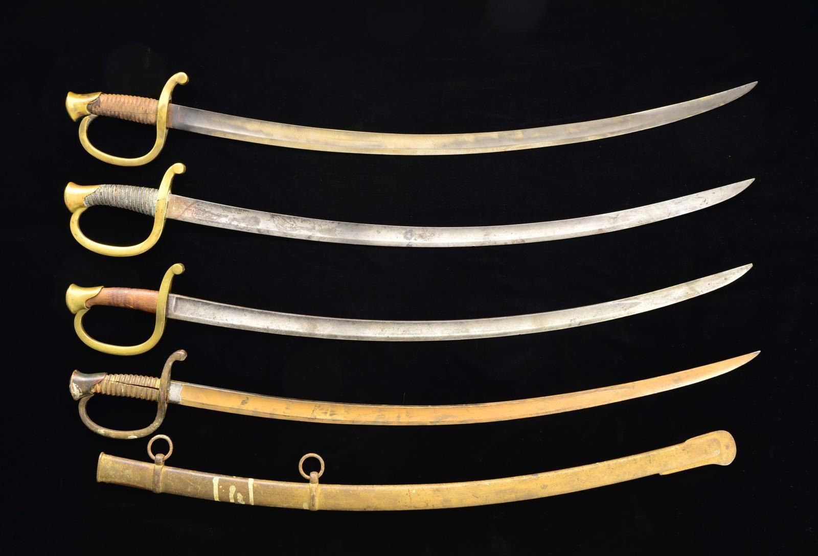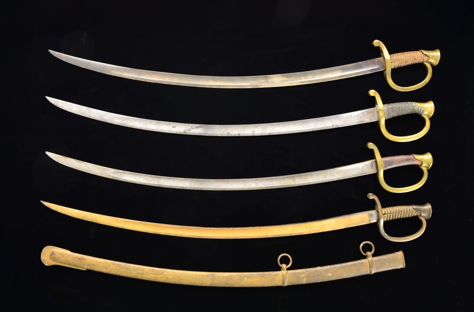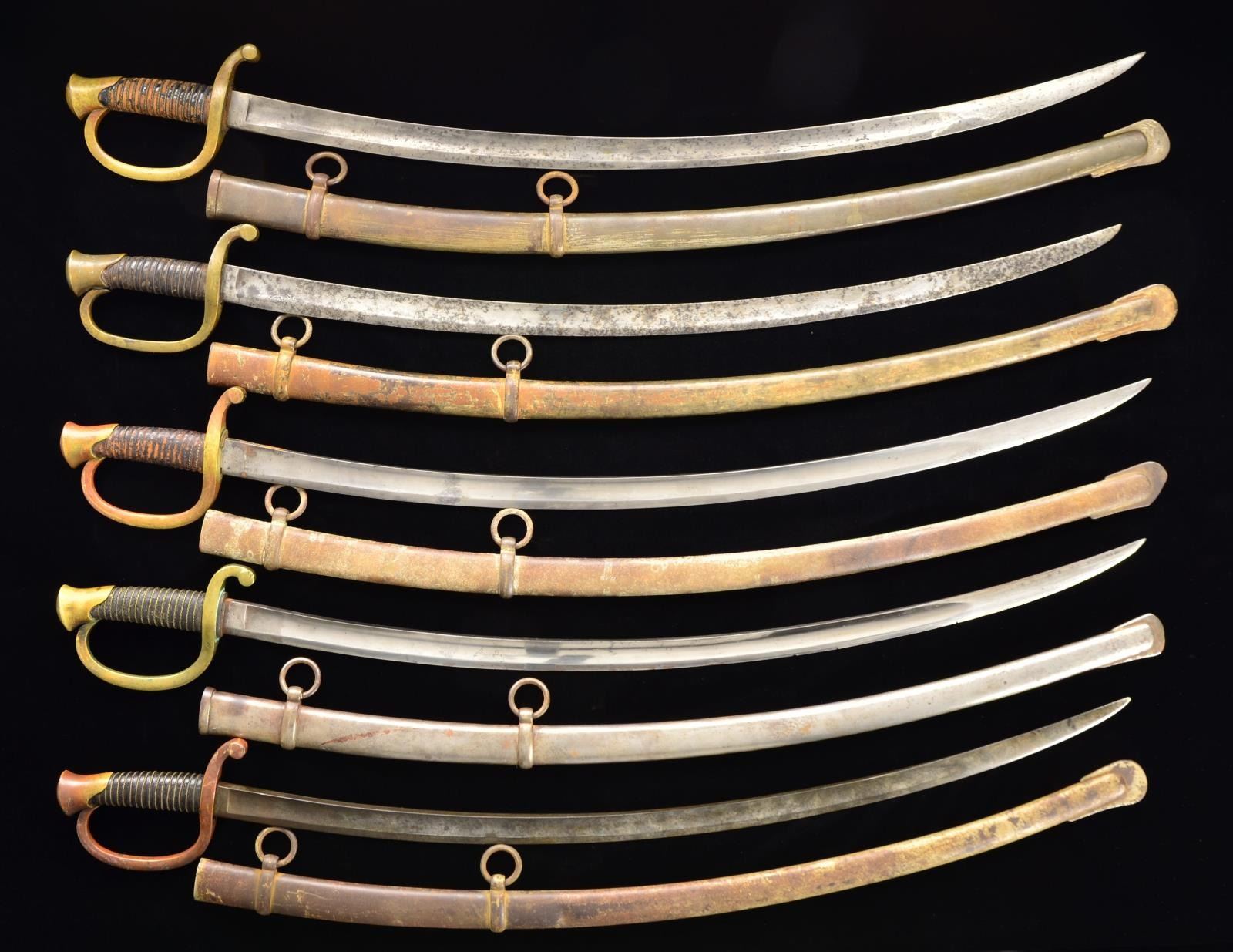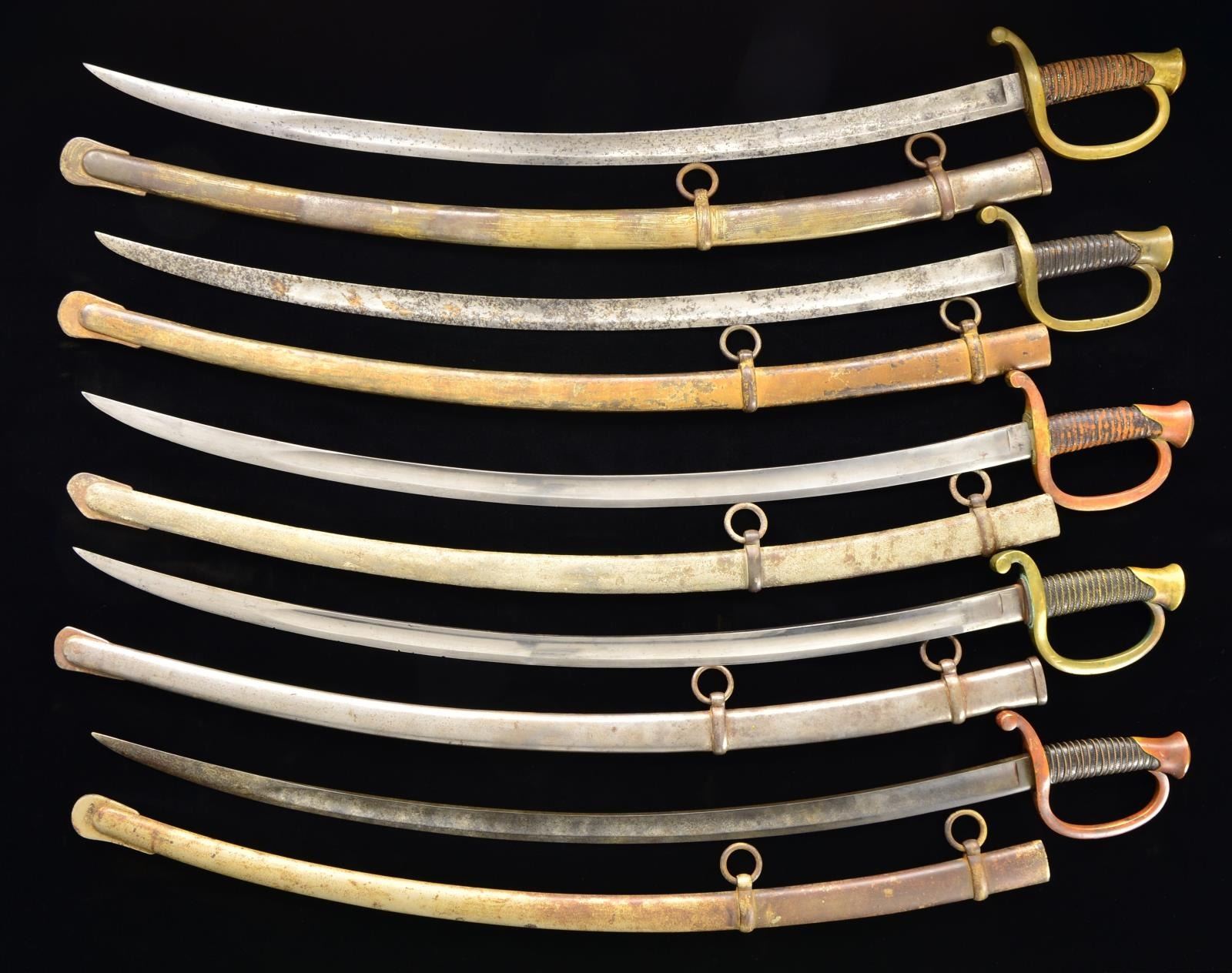 9 artillery sabers, 6 w/ scabbards, several variations, but mostly Ames, one very scarce Roby contract. CONDITION: fair to good overall, most blades are gray w/ old polish making contractor marks only partially visible or not present. (02-14241/JS). $3,000-4,000.