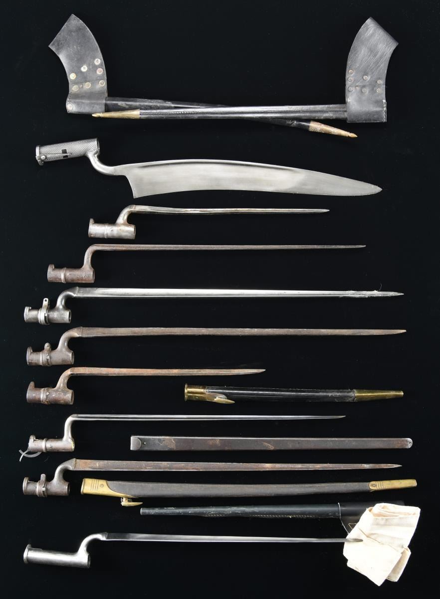 Lot consists of 2 unmarked socket bayonet, 2 "U.S." socket bayonets, 3 Nepalese Martini-Henry socket bayonets, 2 reproduction socket bayonets, as well as 2 leather scabbards. CONDITION: bayonets are good overall, with some exhibiting dark surfaces with pitting and oxidation, and with other bayonets exhibiting a mottled gray patina. 1 US bayonet has been cleaned. Scabbards show wear, but otherwise appear sturdy and serviceable. (02-19611-10/MLW). $250-500.