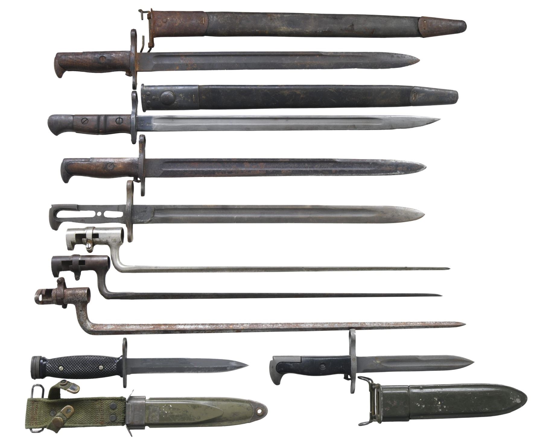 No.1: US M4 Bayonet. 6 9/16" parkerized blade. 11 1/2" overall. Crossguard is marked "U.S. / M4 / CAMILLUS". Black plastic checkered grips. Latch in pommel. Plastic scabbard marked "USM8A1". CONDITION: blade has moderate wear & thinning of its parkerized finish. Edge has been sharpened. Crossguard is loose. Grips have very light wear. Scabbard has moderate wear & staining. No.2: US Model 1942 Bayonet Shortened as Trench Knife. 6 1/2" fullered parkerized blade. 11" overall. Blade markings have been removed due to material removal. Black plastic ribbed grips. Plastic scabbard has been shortened & over-painted w/ green paint. The "US" & "flaming bomb" is partially legible. CONDITION: arsenal rework parkerized finish on metal has thinning & moderate wear. Grips show moderate wear. Scabbard has dents, wear & flaking paint. No.3: British Pattern 13 Bayonet. 17" fullered blade. 21 3/4" overall. Blade is marked on left ricasso "1913 / 7 / 16" & encircled "REMINGTON". Right ricasso contains "broad arrow", two view marks & "X". Straight steel crossguard. Walnut grips secured by two screws. Leather scabbard w/ metal tips. Worn scabbard markings are partly legible, showing "broad arrow". CONDITION: blade has light wear & staining, turning gray & has been sharpened, but still shows the two-tone original finish w/ blue near crossguard. Balance of metal has original blue finish w/ oxidation & fine pitting. Grips have light wear & staining. Scabbard shows considerable wear & scuffing, but stitching remains tight. No.4: US Model 1905 Bayonet. 15 1/2" fullered blade. 20 1/8" overall. Blade is faintly marked on left ricasso "SA / flaming bomb / 1918". Right ricasso is marked "US" & S#. Smooth walnut grips retained by single screw. CONDITION: bayonet has extensive oxidation, wear & pitting throughout. Grips have wear, small cracks & chipping issues. Blade has been heavily sharpened. No.5: US Model 1905 Bayonet. 15 7/8" fullered blade. 20 1/2" overall. Blade marked on left ricasso "SA / flaming bomb / 1918". Marked on right ricasso "US" & S#. Walnut grips show traces of the original coarse turned appearance. Scabbard is leather Model 1917 type. CONDITION: blade shows traces of original blue w/ oxidation & light pitting throughout. Edge has small chipping issues. Grips are well-worn w/ staining. Scabbard has considerable wear, staining & scuffing. Metal parts have extensive oxidation & fine pitting. No.6: US Model 1942 Bayonet. 16" fullered blade. 20 1/2" overall. Has been stripped, retaining only blade & crossbar. Blade marked on left ricasso "UHF / US / flaming bomb / 1942". CONDITION: bayonet shows traces of original parkerized finish w/ moderate wear & light oxidation. No.7: US Model 1873 Socket Bayonet. Triangular 18" steel blade. 21 1/8" overall. Bayonet is marked "US" on the face. Clasp is present. CONDITION: bayonet has turned mostly gray & patina w/ moderate wear throughout. No.8: US Model 1873 Socket Bayonet. 18" steel blade polished bright. 21" overall. Blade is marked "US" on face. Clasp is present. CONDITION: bayonet has cleaned appearance & is returning to gray & patina. No.9: Socket Bayonet. Marked only w/ serial number & acceptance marks. Quadrangular 20 1/4" steel blade. 23" overall. Clasp is present. CONDITION: bayonet is overall gray & patina w/ oxidation & fine pitting throughout. (02-23855/RW). NON-GUN. $300-500.