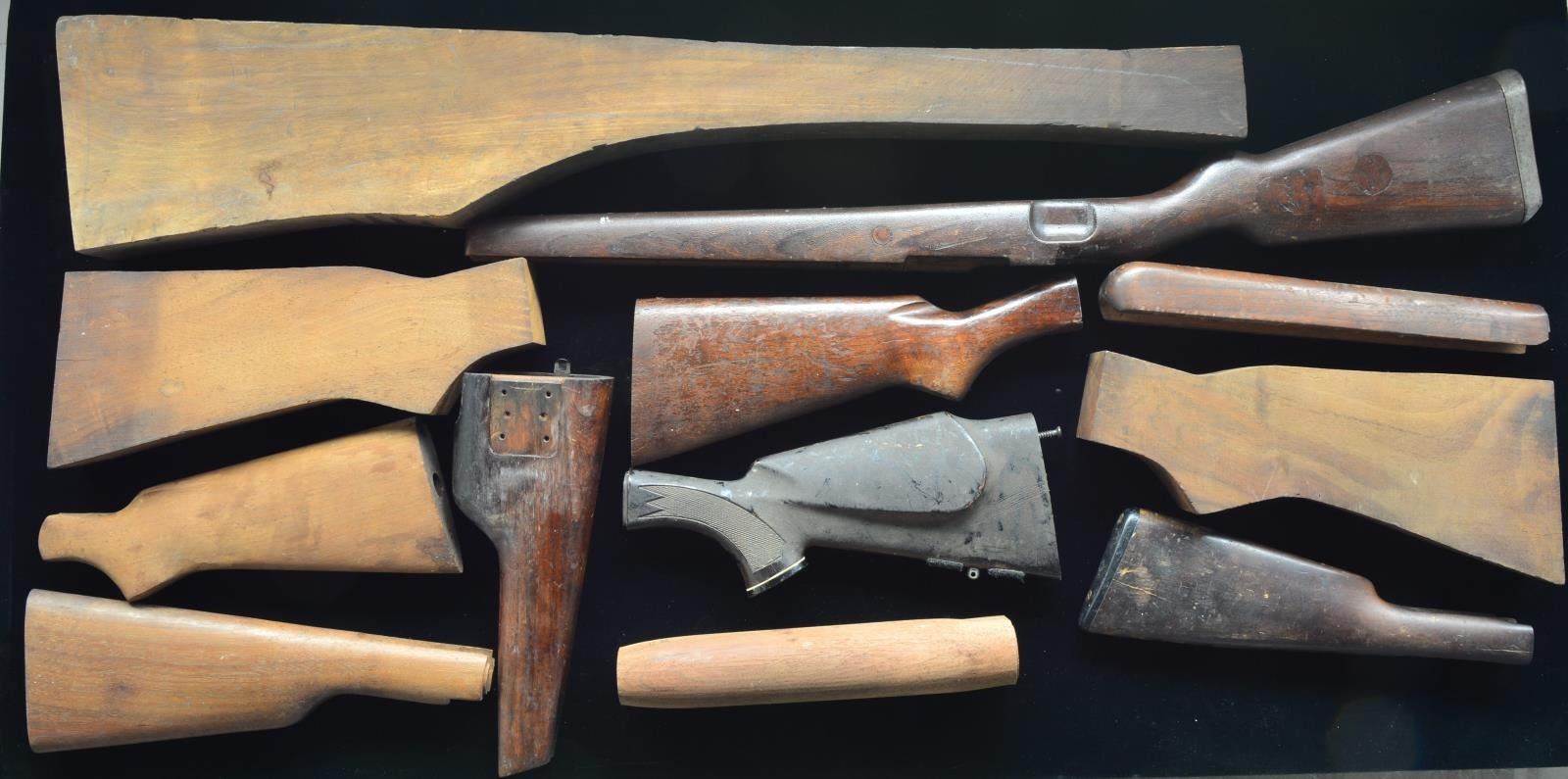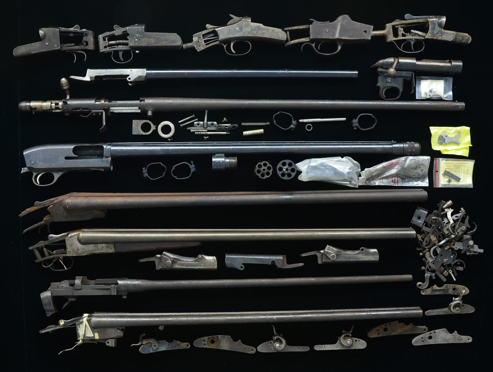 1) CUT DOWN SPRINGFIELD TRAPDOOR BARRELED ACTION. (01-18675). ANTIQUE. 2) 3 SPRINGFIELD TRAPDOOR ACTIONS. (01-18676). ANTIQUE. 3) MISCELLANEOUS LOT OF FORENDS, STOCKS & STOCK BLANKS. Some factory, some aftermarket. 1 Rifle stock blank. / 2 Shotgun blanks. / 1 Take off single shot stock w/ repair at comb. No buttplate. / 1 Pump or semi auto take off stock w/ no buttplate. / 1 Mauser 98 take off stock w/ repairs in buttstock. Metal buttplate. / 1 Semi inlet unfinished beavertail forearm stamped “UNIVERSAL 16 GA.”. / 1 Lg. beavertail single shot forend. / 1 Remington 8/70 w/ fleur de lis checkering. It appears to have been painted. / 1 Broom handle shoulder stock, missing lid & attachment iron. / 1 New in wrapper Browning A5 forend w/ checkering & oil finish. CONDITION: mostly rough. (02-14549/BT). 4) GROUP OF MODERN & ANTIQUE LOCK PLATES, SCREWS, TRIGGERS, HAMMERS & MORE. (02-14564) NON-GUN. 5) ASSORTED SCOPE RINGS. All for 1" tubes unless noted. WEAVER: new in package high extension gloss / 9 various top mt. rings missing some screws / set for 22 grooved receiver plus another for 7/8" tube. BURRIS: matte extension for Weaver bases / Kwik-Site see through for 22 grooved receiver / Kwik-Site see through for unknown center fire. / Robust aluminum set for Weaver base / Aluminum for 22 grooved receiver / silver aluminum for 22 grooved receiver / vintage Redfield; wide front & narrow rear split only at top,(gloss) / Weaver side mt. set w/out mt. screws / Tasco shotgun side mt. w/out screws / Tasco rifle side mt. w/ screws. CONDITION: all very good or better. (02-14565/NW). 6) LONG BRANCH No. 4 MK I* BBL. & ACTION ONLY. S# 32L7895. (20-4105). MODERN. 7) SEARS M66 BBL. & ACTION ONLY. Cal. 12 Ga. NSN. (20-4106). MODERN. 8) ITHACA CRASS BBL. & ACTION ONLY. Cal. 12 Ga. NSN. (20-4107). MODERN. 9) LEFEVER NITRO SPECIAL. Bbl., forearm, & action only. Cal. 16 Ga. S# 275276. (20-4108). MODERN. 10) WESTERNFIELD M128 FR BBL. & ACTION ONLY. Cal. 12 Ga. NSN. (20-4109). MODERN. 11) HOPKINS & ALLEN FALLING BLOCK SHOTGUN ACTION ONLY. NSN. (20-4110). MODERN. 12) WESTERNFIELD 5000 ACTION ONLY. S# C36922. (20-4111). MODERN. 13) WESTERN ARMS LONG RANGE BBL. & ACTION ONLY. S# 51114. (20-4112). MODERN. 14) UNMARKED SINGLE SHOT SHOTGUN ACTION ONLY. NSN. (20-4113). MODERN. 15) AMERICAN GUN CO. VICTOR 12 GA SHOTGUN ACTION ONLY. S# 518700. (20-4114). MODERN. 16) CRESCENT DAVIS "DAVIS CERTIFIED SHOTGUN" ACTION ONLY. S#1966. (20-4115). MODERN. 17) PRE-64 UNMARKED BOLT ACTION ONLY. CONDITION: all mostly poor condition w/ a few exceptions unless otherwise stated. (20-4116). MODERN. $550-950.