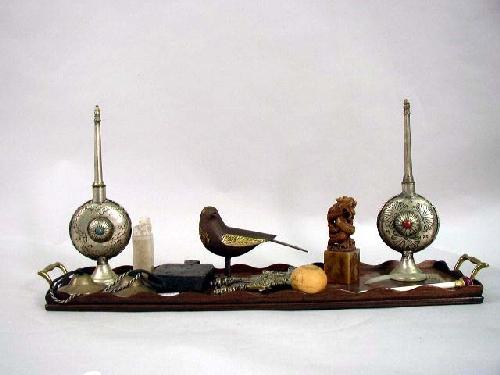 GROUP OF ASSORTED ORIENTAL STYLE TABLE ARTICLES; comprising two jewel-mounted oilers, choks, snips, a gourd,a figural bird and a tray with scalloped edge.