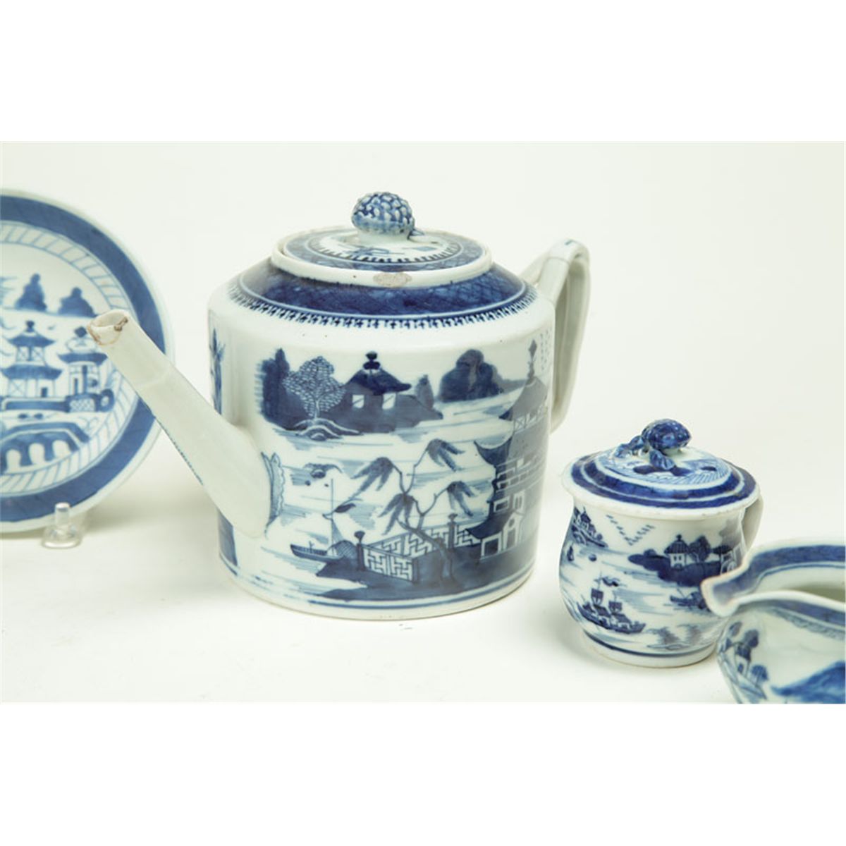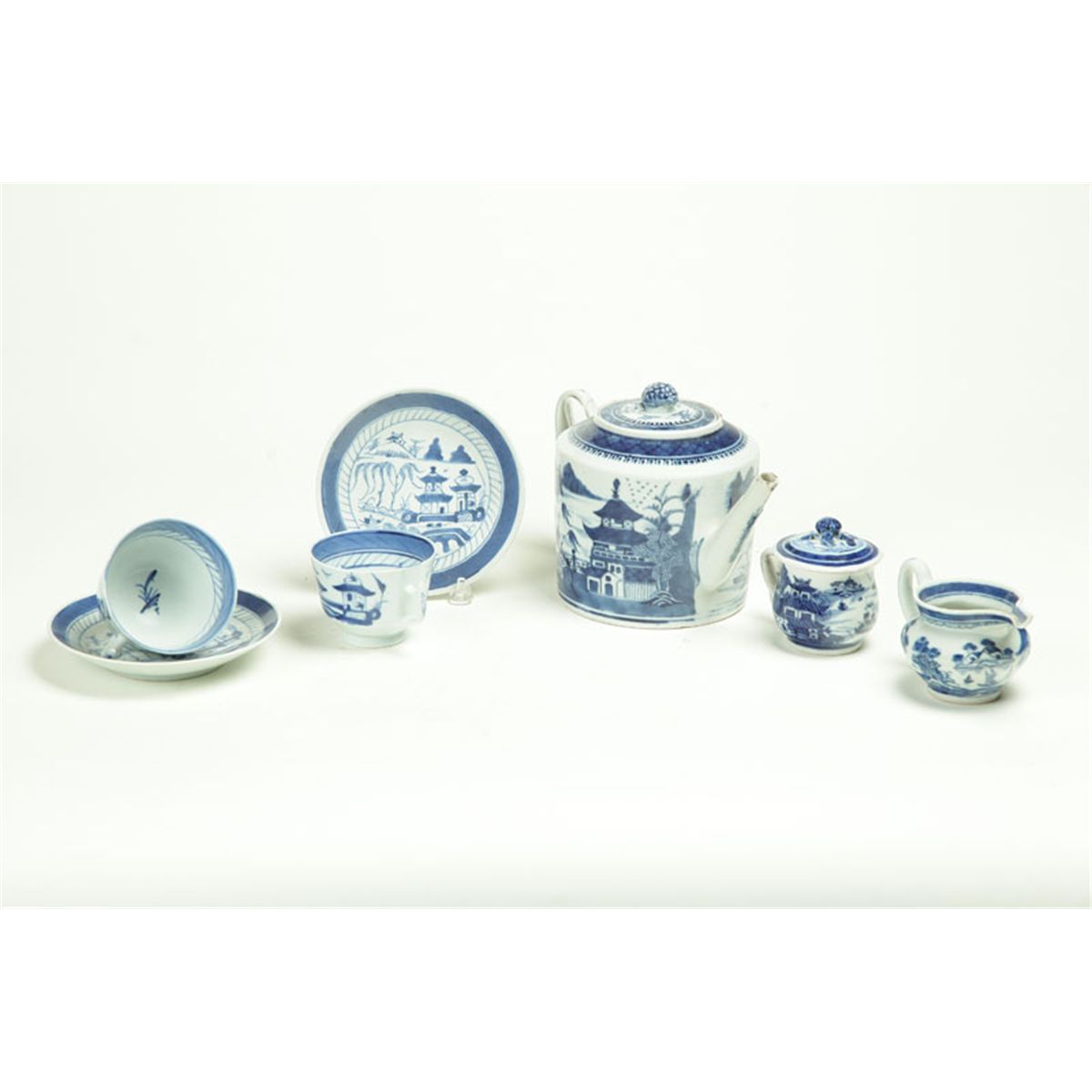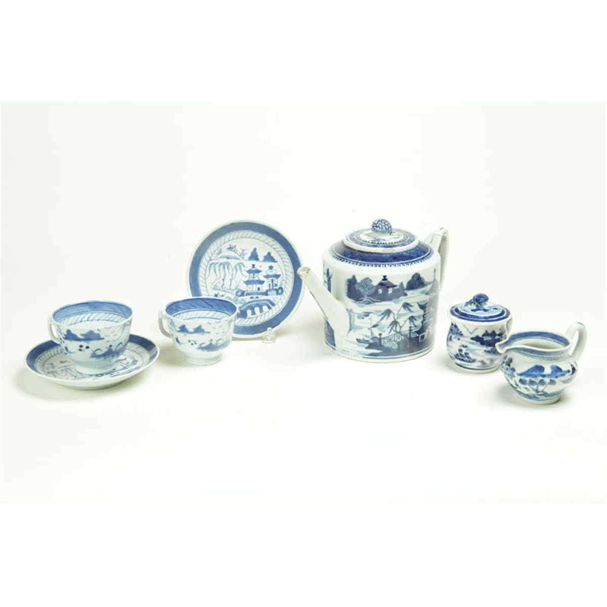 China, 19th century, porcelain. Includes a 5 1/2"h. teapot with berry finial, a 3"h. cream pitcher, a 3 1/4"h. covered sugar bowl, and two cups and saucers. Damage.