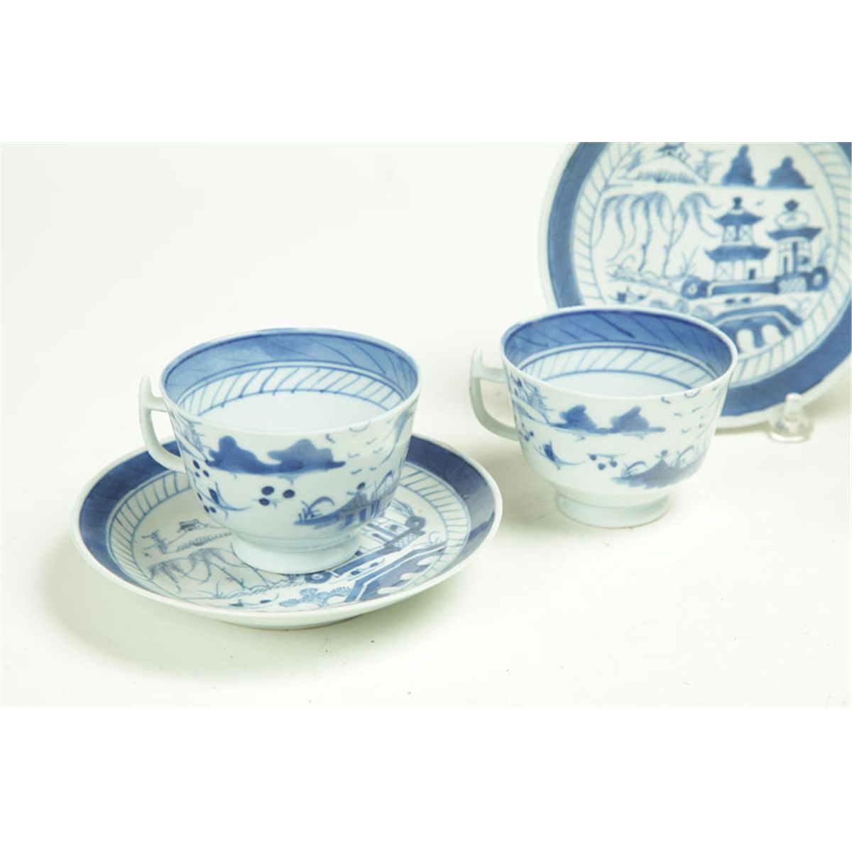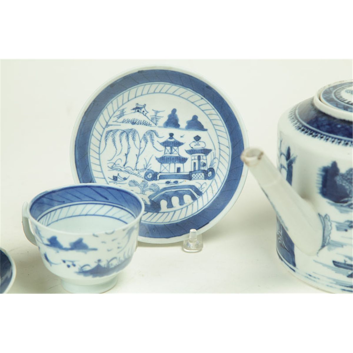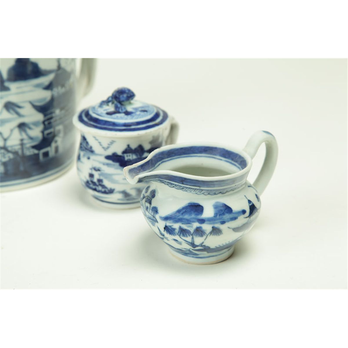 China, 19th century, porcelain. Includes a 5 1/2"h. teapot with berry finial, a 3"h. cream pitcher, a 3 1/4"h. covered sugar bowl, and two cups and saucers. Damage.