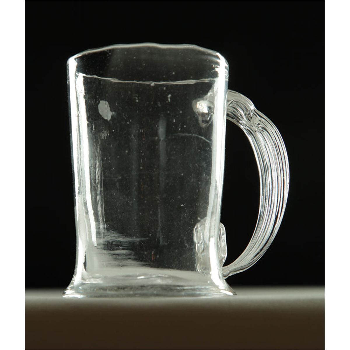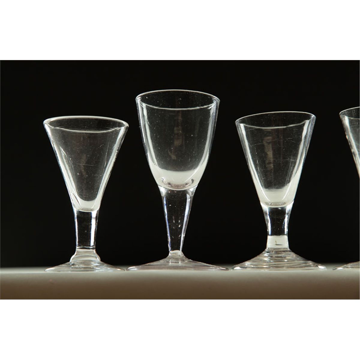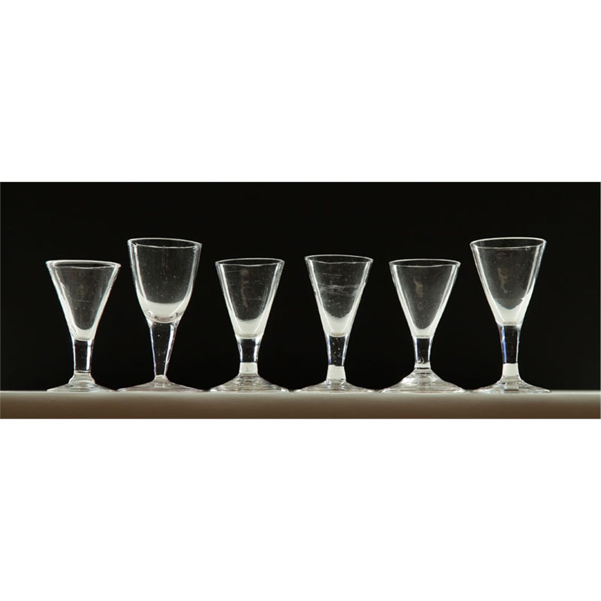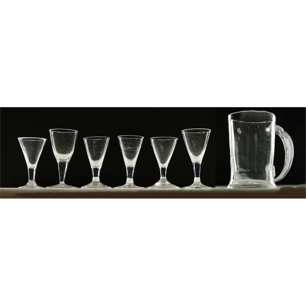 American and English, 19th century. Six blown glass cordials. All of similar form. One with rim flake. 4" to 4 1/2"h. Six lacy glass cup plates, 3"d., and a blown mug with applied handle, 4 1/4"h. Together with a flip, 6"h.
