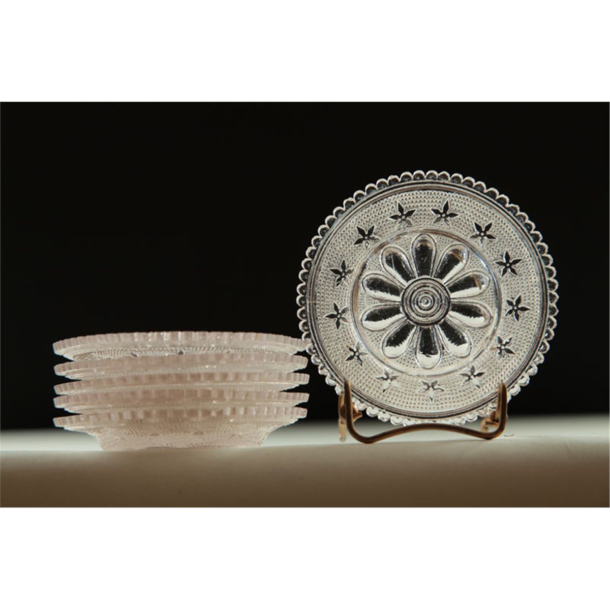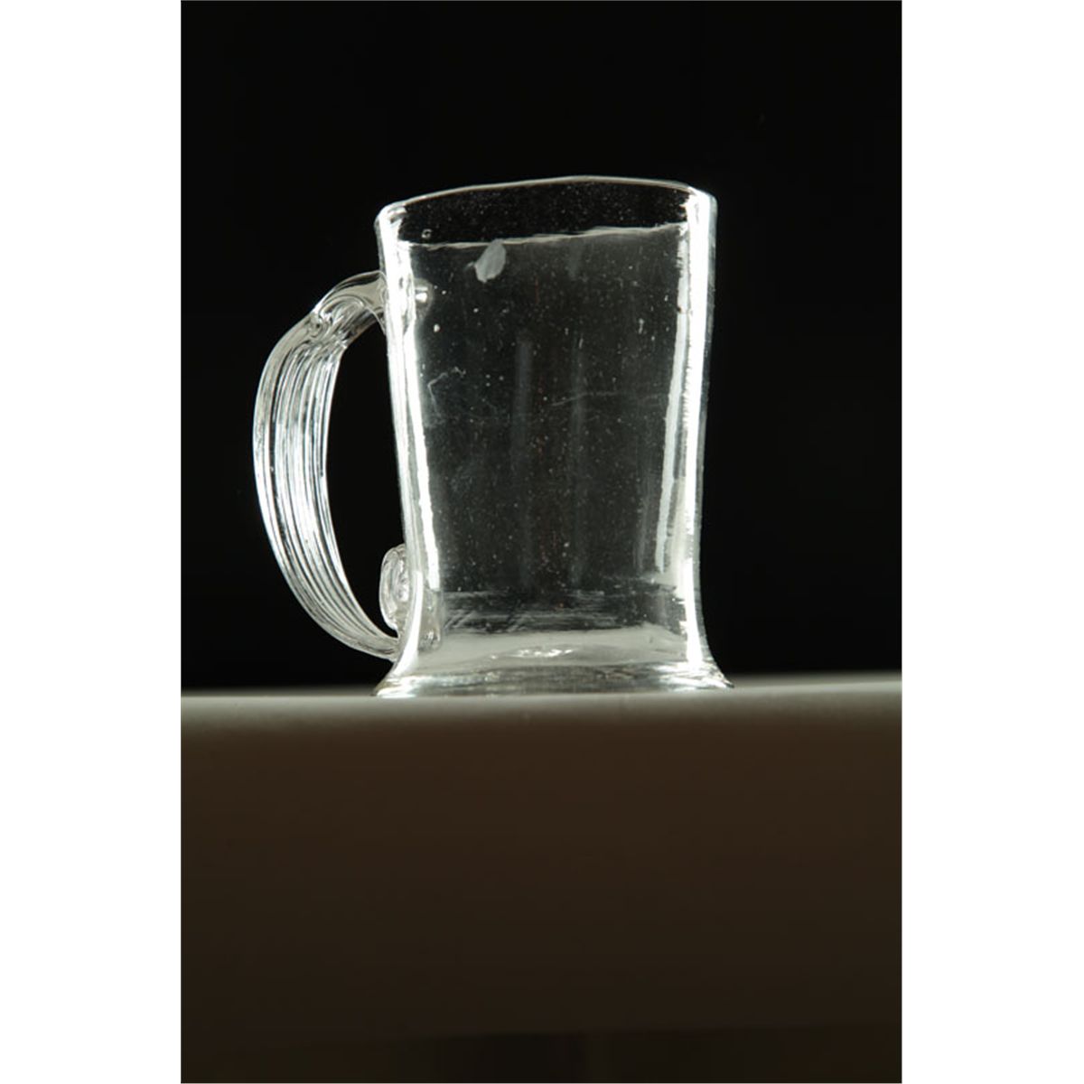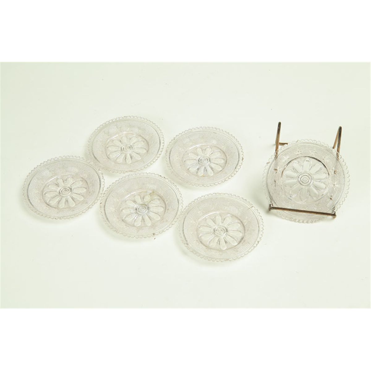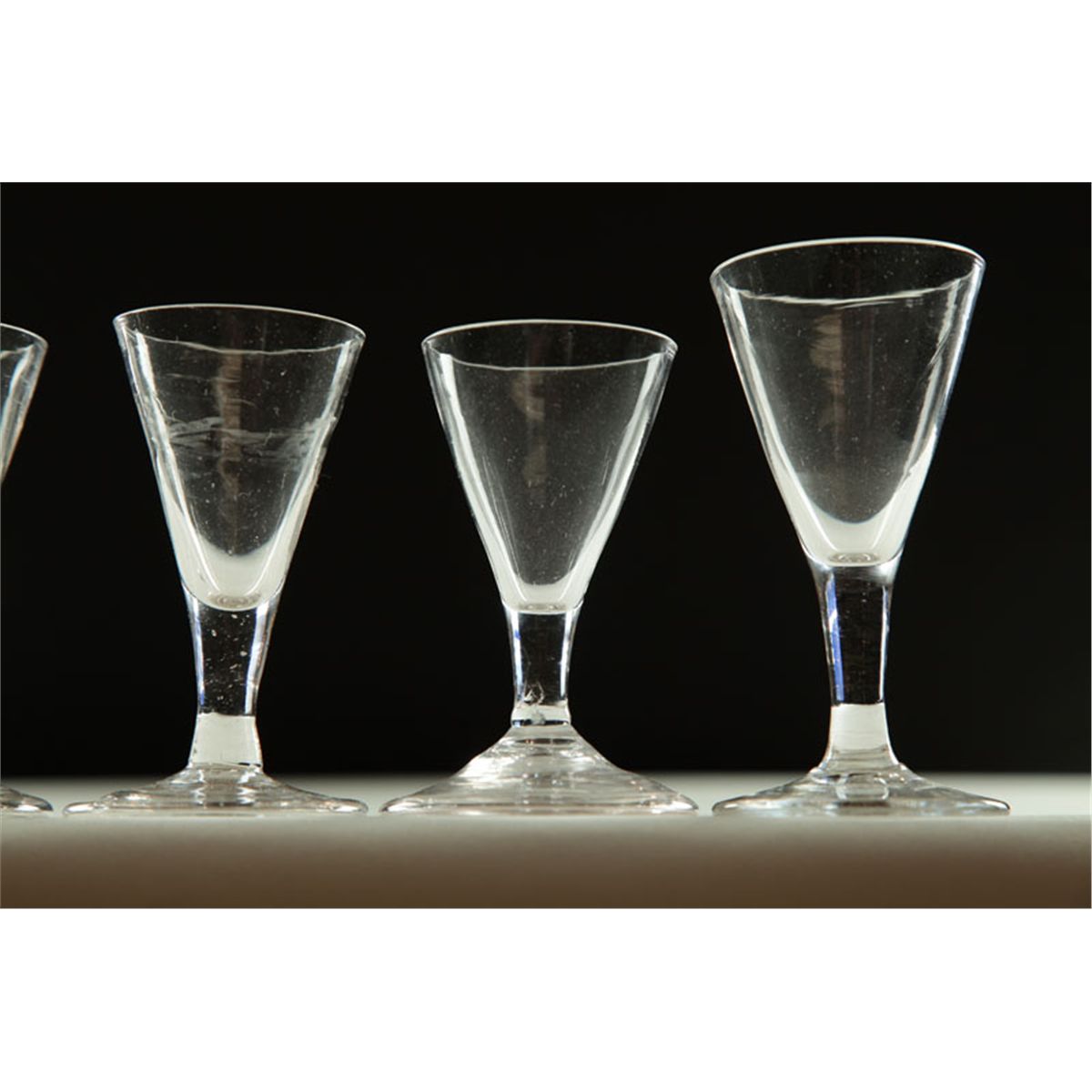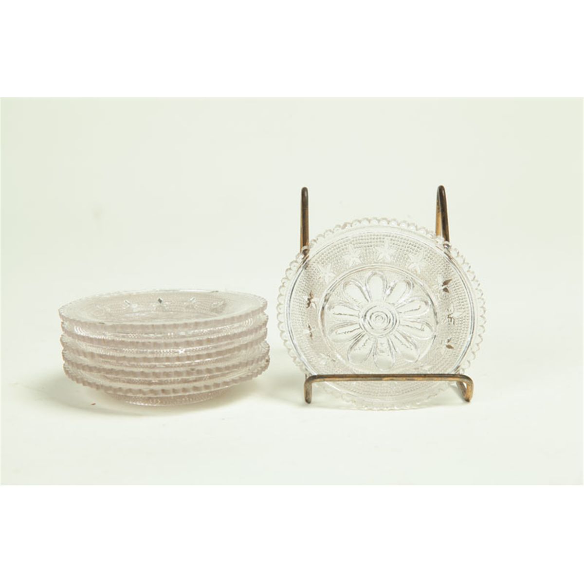 American and English, 19th century. Six blown glass cordials. All of similar form. One with rim flake. 4" to 4 1/2"h. Six lacy glass cup plates, 3"d., and a blown mug with applied handle, 4 1/4"h. Together with a flip, 6"h.