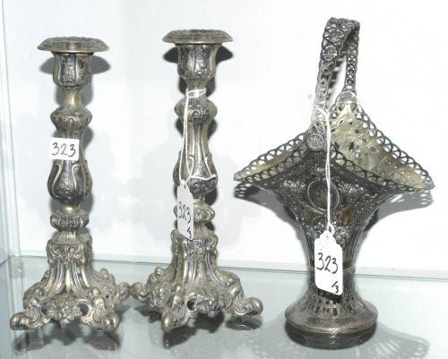 GROUP OF CONTINENTAL SILVER, pair of .800 candlesticks and a .800 repousse basket, PACKING AND SHIPPING (excluding insurance) $30,