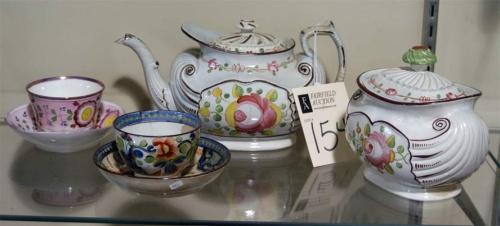 GROUP OF CREAMWARE King's Rose teapot and sugar together with Gaudy Dutch and pink luster cups and saucers early 19th century <BR>condition: most with cracks or chips