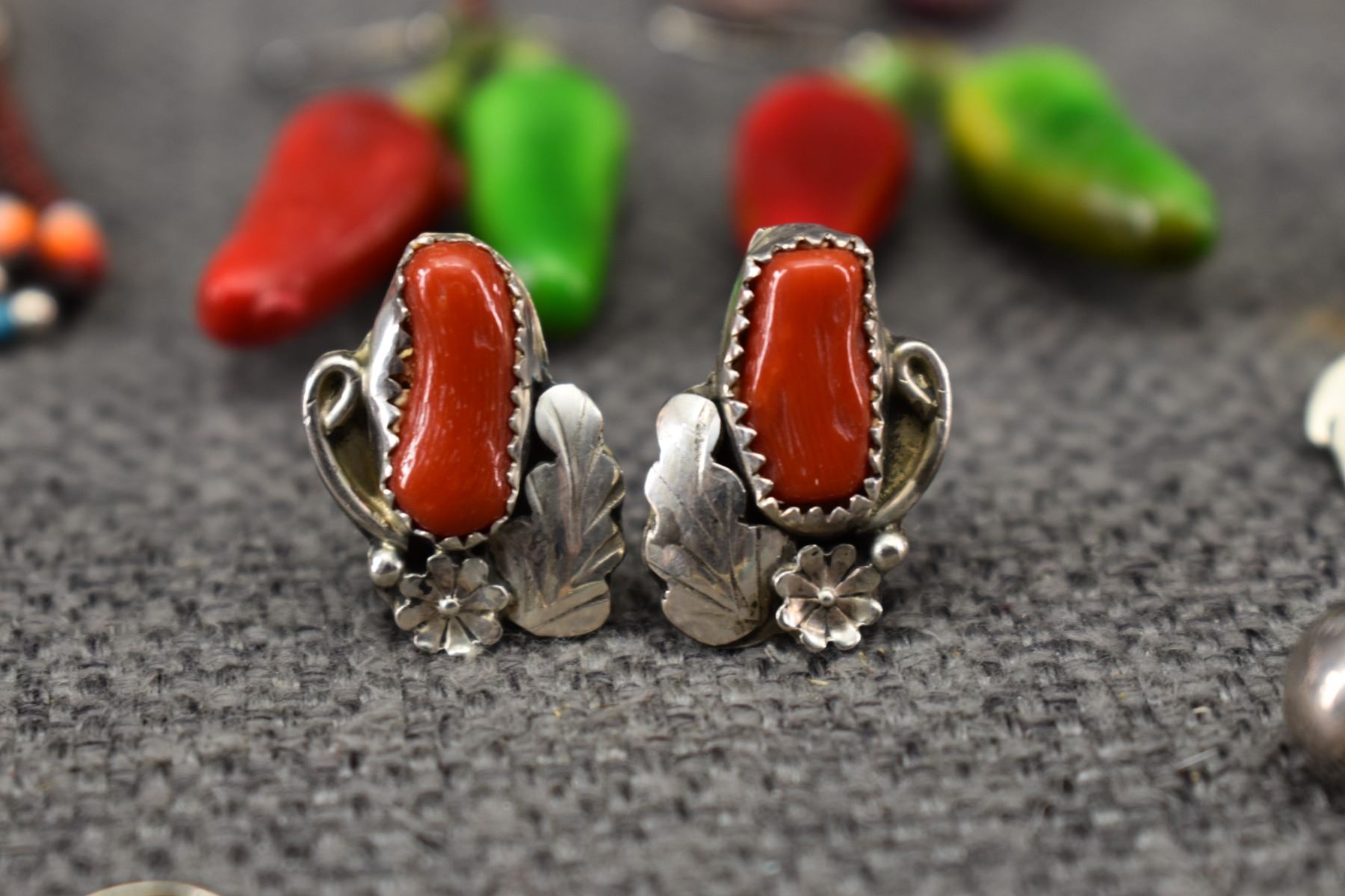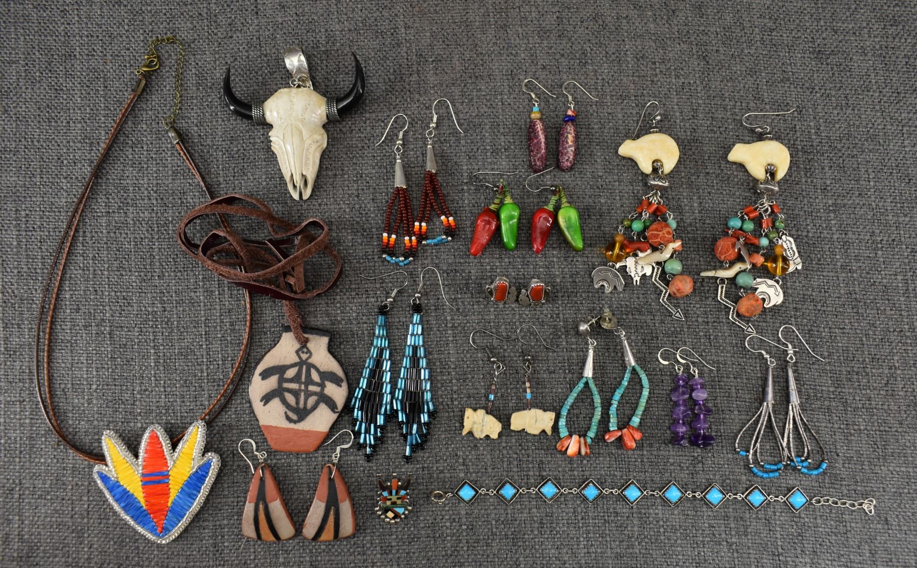 contemporary all pierced ear include shell glass beads turquoise stone and silver longest 4.5" shortest .75". Pottery earring s and pendant by Marlinda Coriz, bone carved skull, Sterling silver and turquoise link bracelet by ML Perry