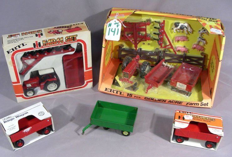 Set includes: 1:32 scale box farm set with tractor and plow, a tractor wagon and plow, a boxed 15 pc. Golden Acre Farm set (never opened) with tractors, wagons and animals, 2 barge wagon in boxes.