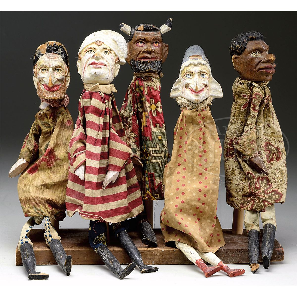 Beautifully carved wooden head puppets with excellent patinaed hand painting. Wooden hands and feet on all. Period clothing. SIZE: 12 to 13" t. CONDITION: Replaced dowels on all puppets and set within a wooden plank base. Appropriate wear and aging - good to very good. 1-13473