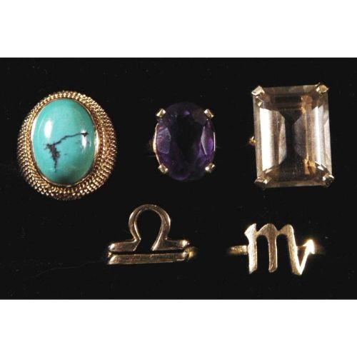 GROUP OF FIVE GOLD RINGS including tourquoise,, PACKING/SHIPPING within continental U.S. excluding insurance (which is required) will be handled by Fairfield Auction for $20,