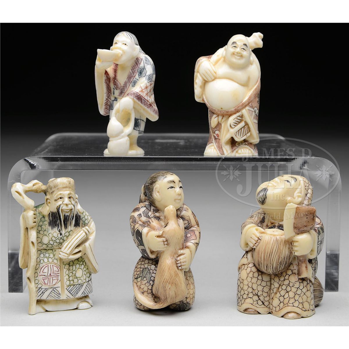 Japan. Netsuke carvings of various subjects, human and animal. Many with colored details. SIZE: Each approx. 2" l. CONDITION: Very good. 9-92385