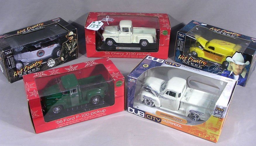 Including: 2 Hot Country racing classic cars - Hank William Jr. and Allen Jackson, a Dove City Old School 1951 Chevy Pickup and a boxed 1956 Ford F100 Pickup and a 55 Chevy 3100 Pickup. All in original boxes.