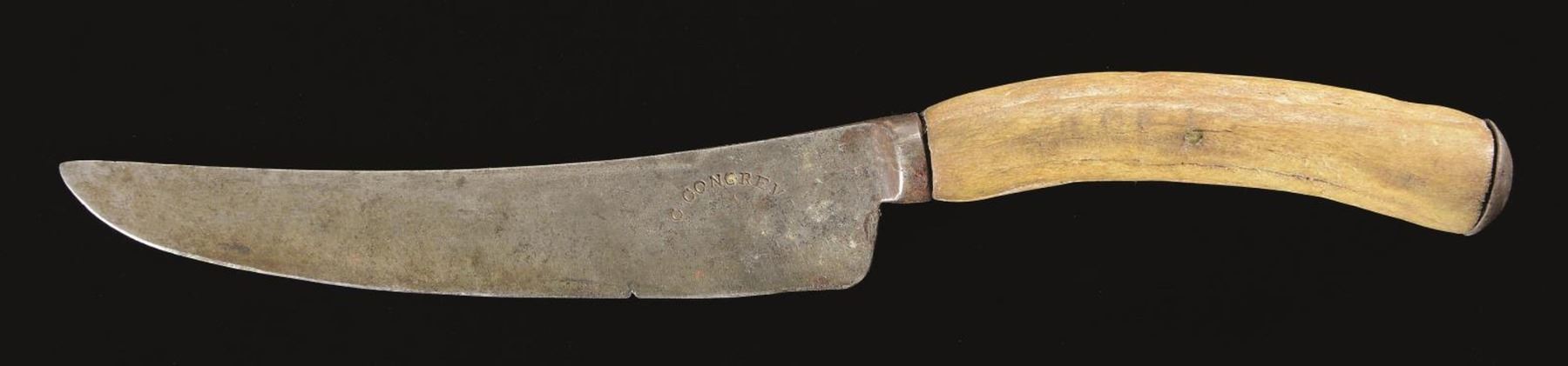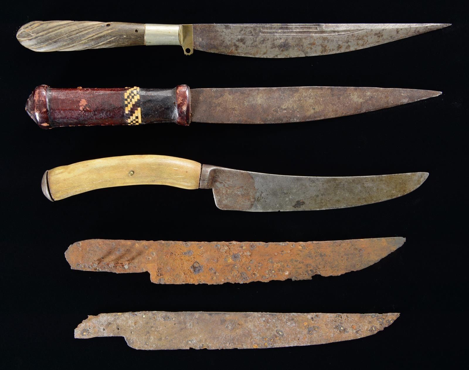 Pictured and described on pages 191-192 in "The Fur Trade". Author, Milton Von Damm: "The scalping knife had a distinct blade shape featuring a fairly straight top edge and a gradual curve on the lower cutting edge. It was cheaper than a butcher knife. The blade was usually 6 to 7 inches long and the handle was wood, sawed 2/3 of its length to receive the blade tang, which was then fastened with 2 or 3 rivets. Most scalping knives were made in England, although they were also a French trade item. This was the most popular knife with Indians. Roachbelly knife marked by Charles Congreve, a Sheffield maker of razors, Bowie and Roachbelly knives between 1829 and 1843. The handle is attached with one brass pin and a round metal disc at the end. The Hudson's Bay Company ordered these knives in large quantities from Sheffield from the 1680's to 1860 and called them a "Roachbury" or "Roachbelly" knife pattern. This pattern had a scalper type curve on the 5 3/4 inch blade and an integrated bolster at the curved handle. The classic scalping knife ordered from about 1750 through the 1800's by the thousands by all trading companies is very rare today because most were either worn out or buried with their owners. This collection is fortunate to have two excavated blades. They originally had wooden handles attached with three rivets. The blades are 7 inches long and are wider than the earlier French scalping knives". UNATTACHED ACCESSORIES: Copy of "The Fur Trade, A History of Arms and Trade Goods" by Milton von Damm. CONDITION: good overall, 2 excavated blades are poor with heavy pitting. PROVENANCE: Lifelong Collection of author Milton Von Damm. (02-22239-4). $300-400.