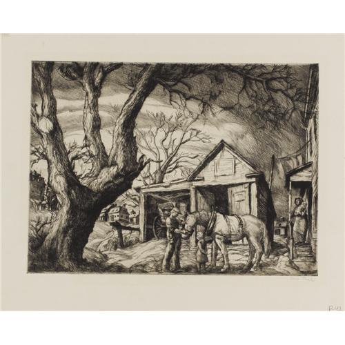 <B>GROUP OF FOURTEEN PRINTS</B></I><BR>Including works by <B>SAM THAL</B></I> (American 1903-1964); <B>ASA CHEFFETZ</B></I> (American 1897-1965); <B>MELVILLE T. WIRE</B></I> (American b.1877); <B>PHILIP CHENEY</B></I> (American b.1897); <B>SAMUEL CHAMBERLAIN</B></I> (American 1895-1875); <B>ALICE EDITH RUMPH</B></I> (American b.1877); <B>WILLIAM MACLEAN</B></I> (American 1897-1977); <B>CHAUNCEY F. RYDER</B></I> (American 1868-1949)<BR><I>Jerome's House, Buzzards Bay; Belmont Farm; In Deep Vermont; Along the Winooski; Border Country; Covered Bridge; Cabin by the River; April Thaw; The Church Yard, Williamsburg; The Semple house, Williamsburg; Spanish Oak, Charleston S.C.; Bruton Parish Church, Williamsburg, VA; The Sentinel; Farmyard in Winter</B></I><BR>Etchings, wood engravings and lithograph<BR>9-3/4 x 12 inches largest, (24.8 x 30.5 cm) (largest)<BR>Signed; some titled and numbered; inscribed in the lower margin<BR><BR>Provenance:<BR>Bessie Heard (McKinney, Texas);<BR>Bessie Heard Trust <B>Condition Report:</B> Normal signs of wear as appropriate with age, some minor toning and old mounting tabs<BR><BR><b>Shipping:</b> Requires 3rd Party Shipping (<a target="_blank" href="http://www.heritageauctions.com/common/shipping.php">view shipping information</a>) <BR><BR><B>Important not