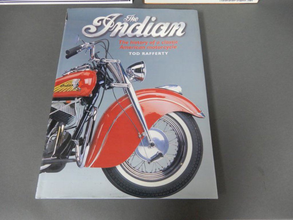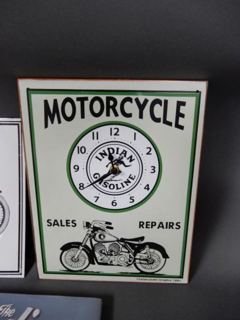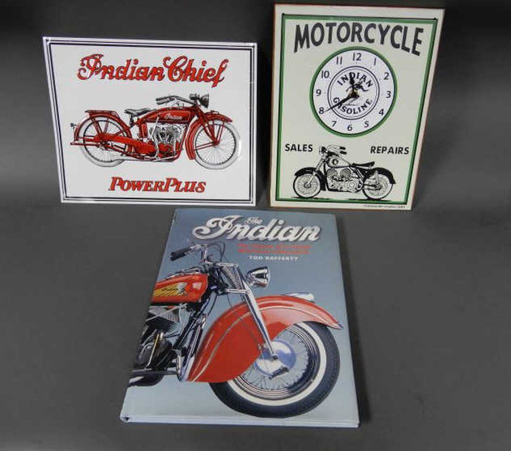 INDIAN GASOLOINE SST SIGN WITH BATTERY OPERATED CLOCK - INDIAN CHIEF POWER PLUS SST EMBOSSED SIGN - THE INDIAN HISTORY HARD COVER BOOK