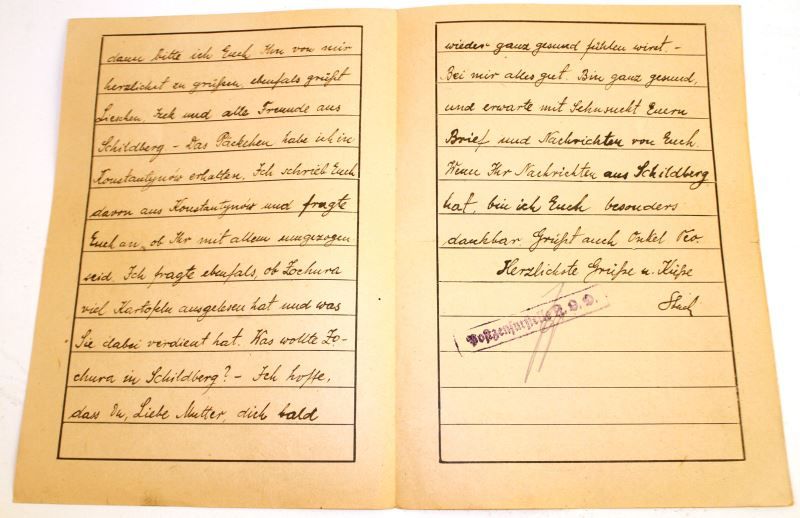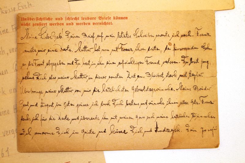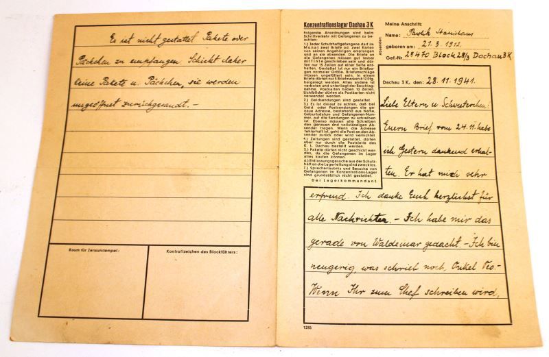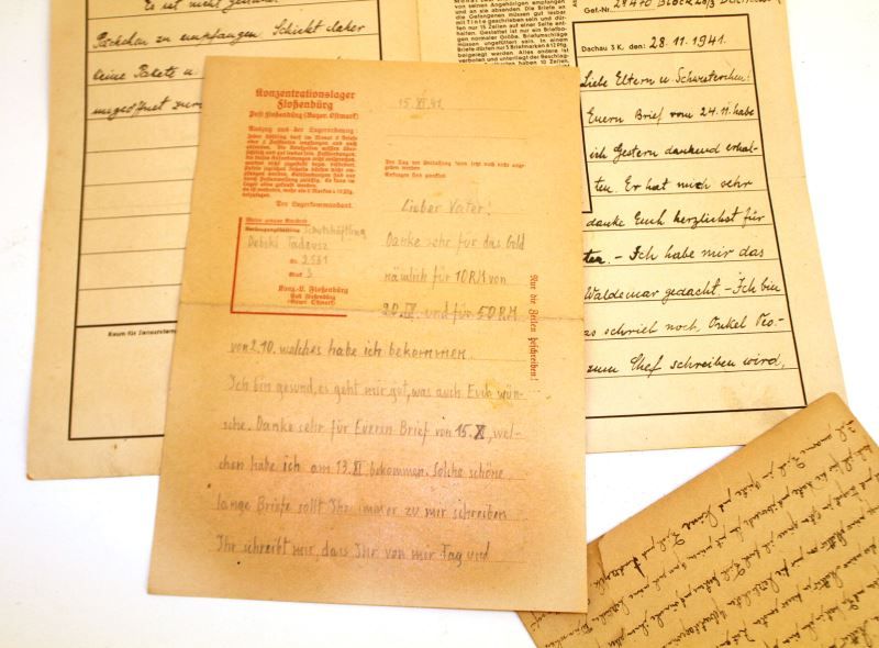 3 Hand written letters from various concentration camps. 1 from Buchenwald, Dachau, and Slossenberg. Some yellowing is present; overall in very good condition.