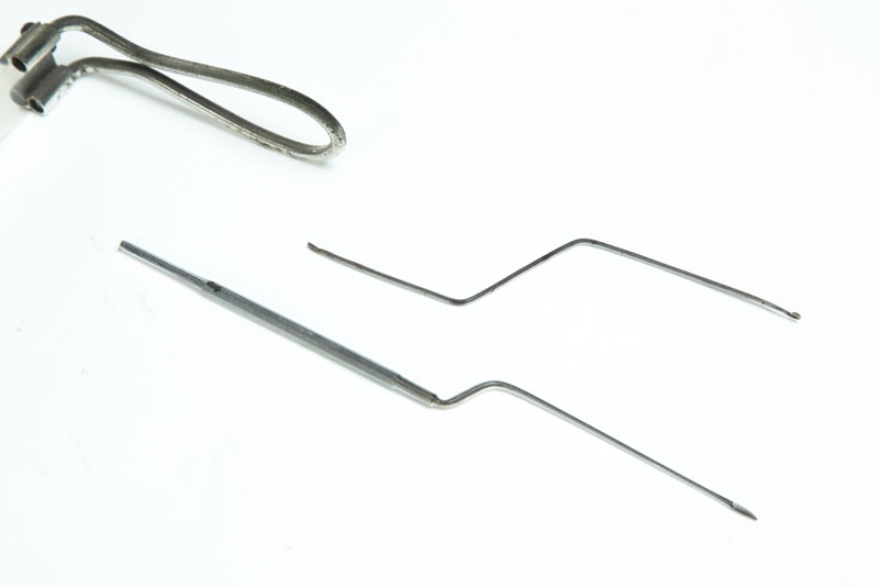 American, late 19th-20th century. Two syringe kits, aural and laryngeal viewing tools, and an endoscope in a case marked "American Endoscopic Co., Providence, Rhode Island", 8"l.