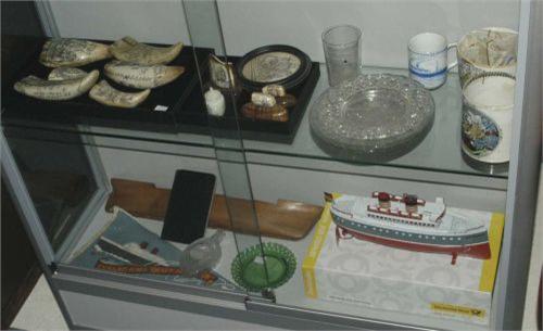 GROUP OF NAUTICAL COLLECTIBLES Schuco toy boat, half hull, glass, and scrimshaw, packing and shipping w/i continental USA (excluding insurance) $35