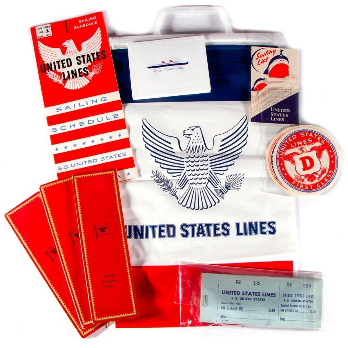A miscellaneous grouping of United States Lines ephemera, including a sailing schedule, bag, steamer rug hire ticket book, bridge scoring pads, etc.