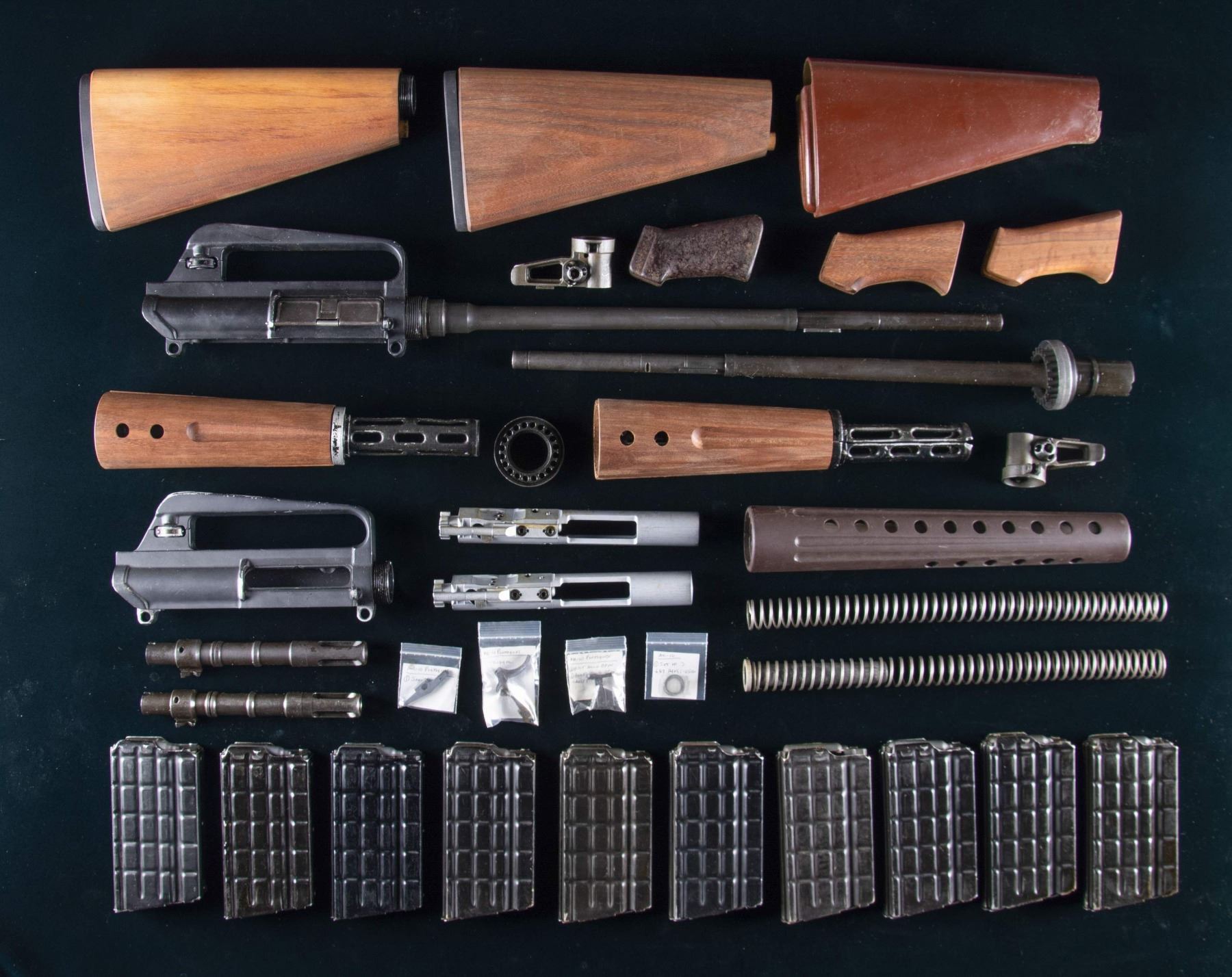 Assortment of AR-10 parts including the following: 2 upper receivers, 2 barrels, 2 complete bolt carriers, 19 waffle pattern 7.62 NATO mags., 3 delta rings, 2 muzzle devices, 3 front sight assemblies, 4 gas tubes, 2 buffers w/ recoil springs, 2 wood shoulder stocks, 1 plastic shoulder stock, 2 wood heat shield assemblies w/ wood furniture, 3 plastic handguard sets, 2 wood pistol grips, 1 plastic pistol grip, 2 sets of fire control group parts, several small misc. parts. CONDITION: Most parts are as removed from prior firearms, w/ some showing little to no sign of prior use. (02-24590-3/JZ). NON-GUN. $1,200-1,800.